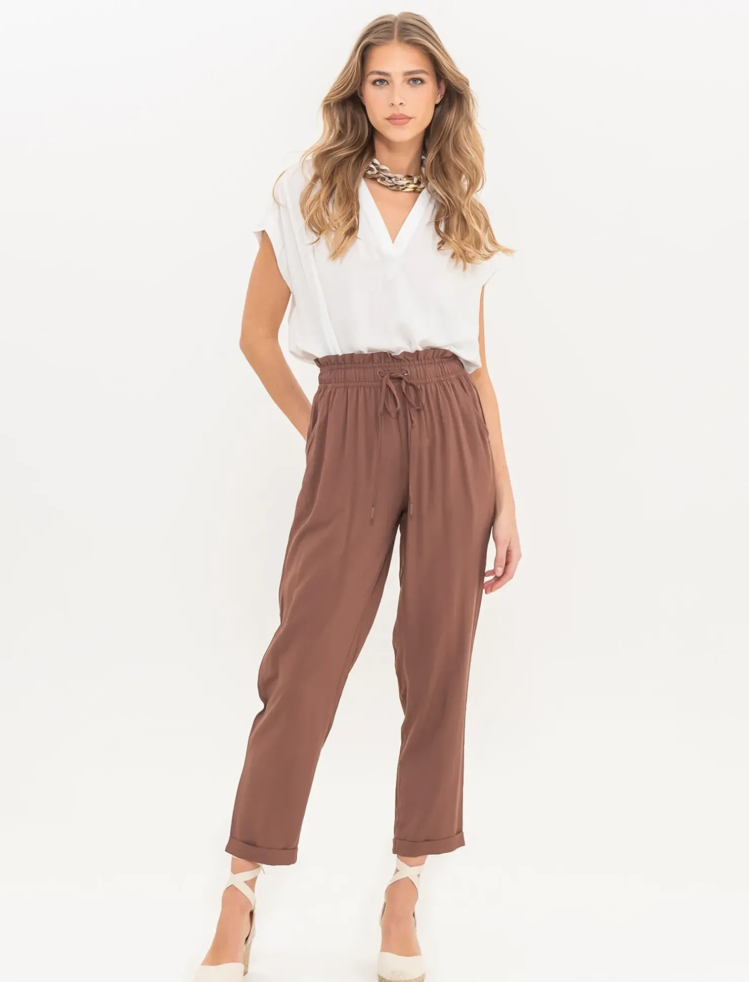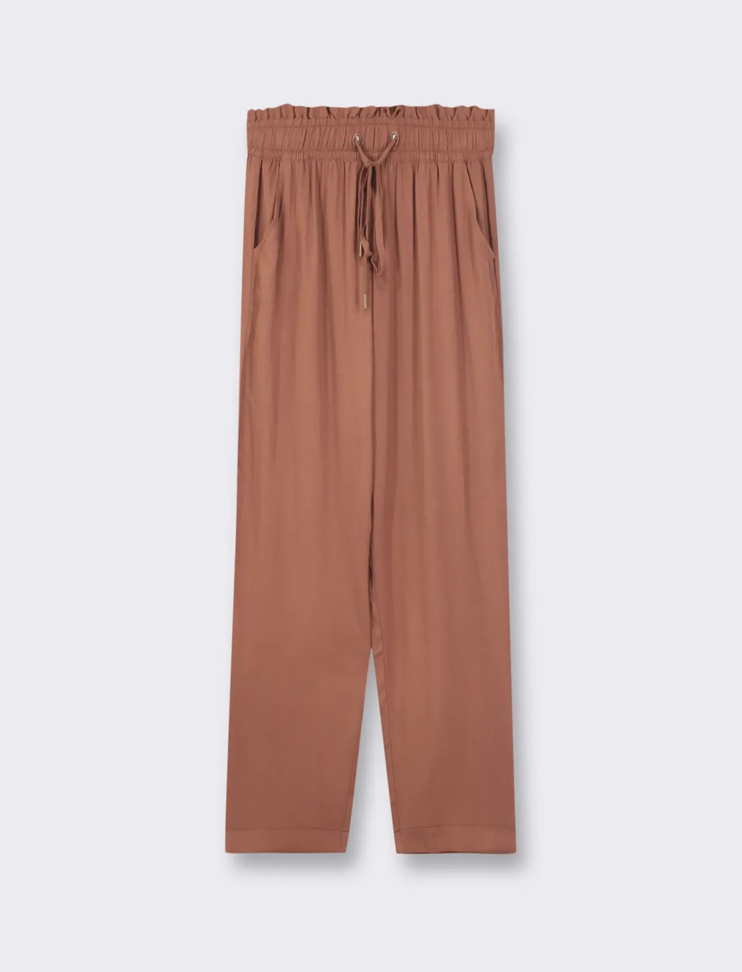 Comfort e stile del nostro pantalone in viscosa leggero, con una pratica fusciacca ed elastico in vita. Perfetto per ogni occasione, questo capo sarà un alleato prezioso nel tuo guardaroba estivo. Coniuga eleganza e praticità con un solo capo! Il prodotto è di colore Cacao