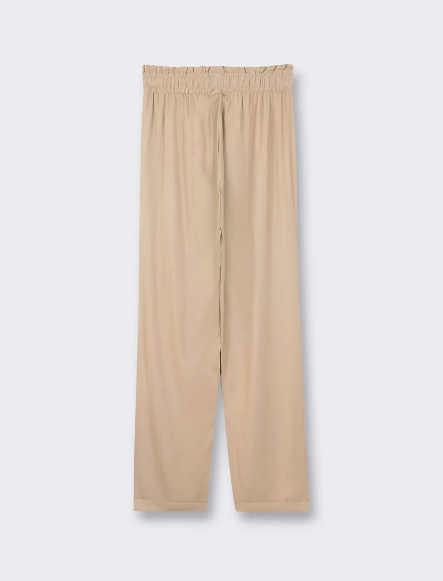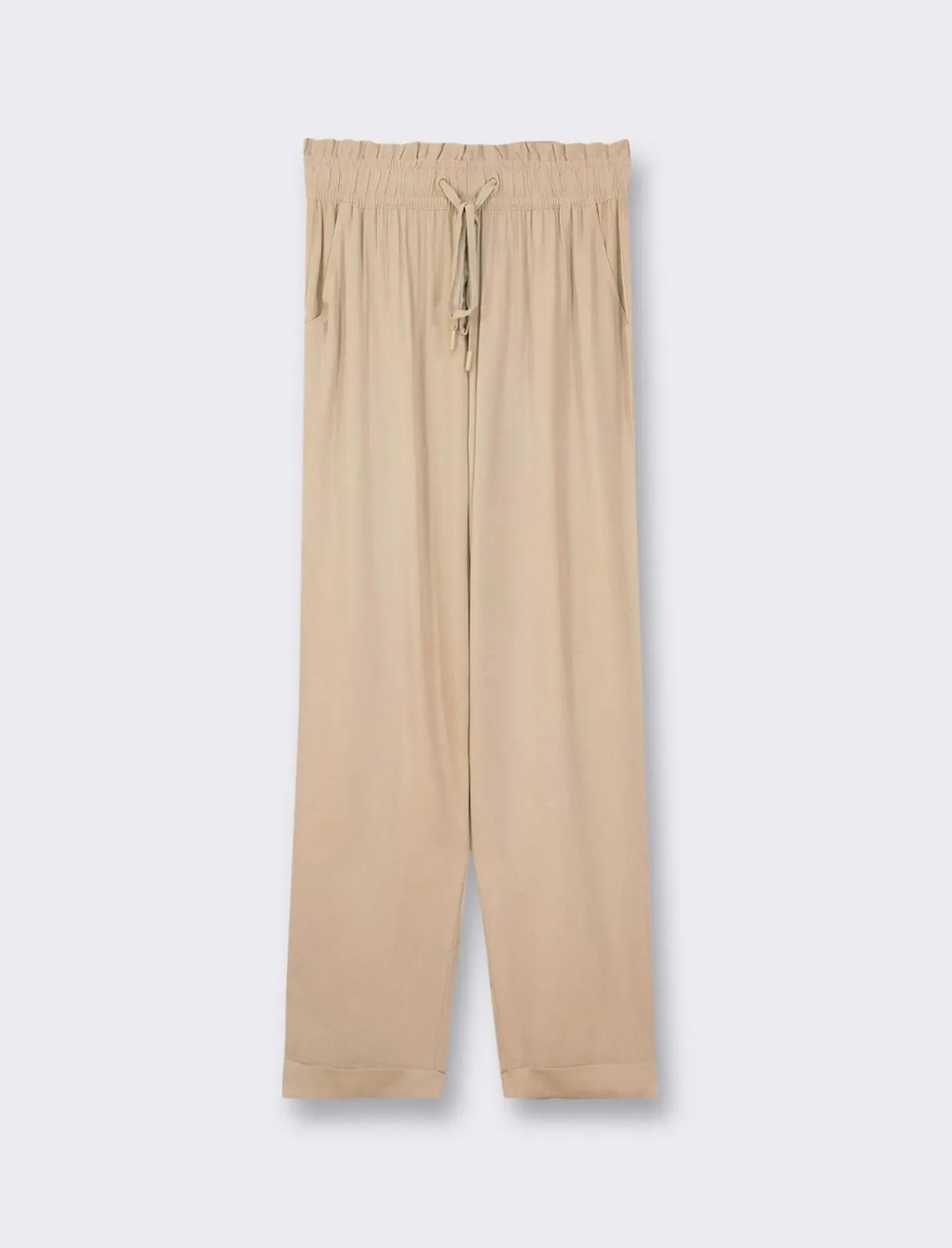Comfort e stile del nostro pantalone in viscosa leggero, con una pratica fusciacca ed elastico in vita. Perfetto per ogni occasione, questo capo sarà un alleato prezioso nel tuo guardaroba estivo. Coniuga eleganza e praticità con un solo capo! Il prodotto è di colore Beige fieno