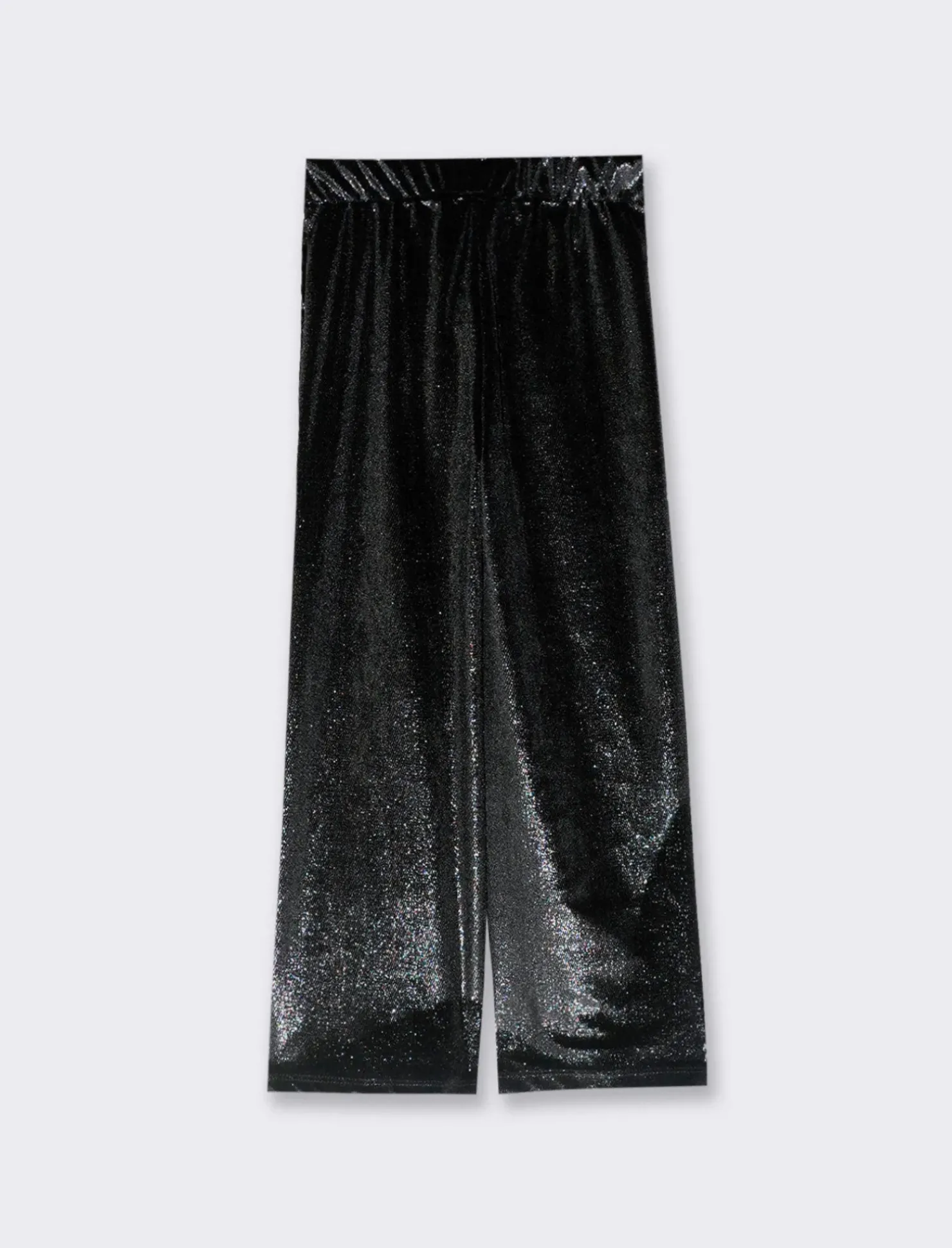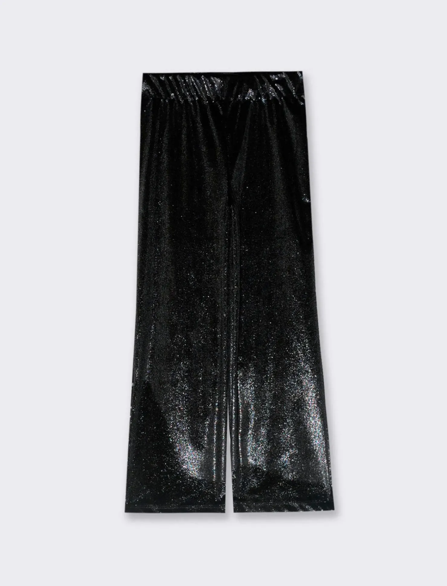 Pantalone da bambina in tessuto elastico lucente; modello gamba larga, comodo ed elegante. Il prodotto è di colore Nero