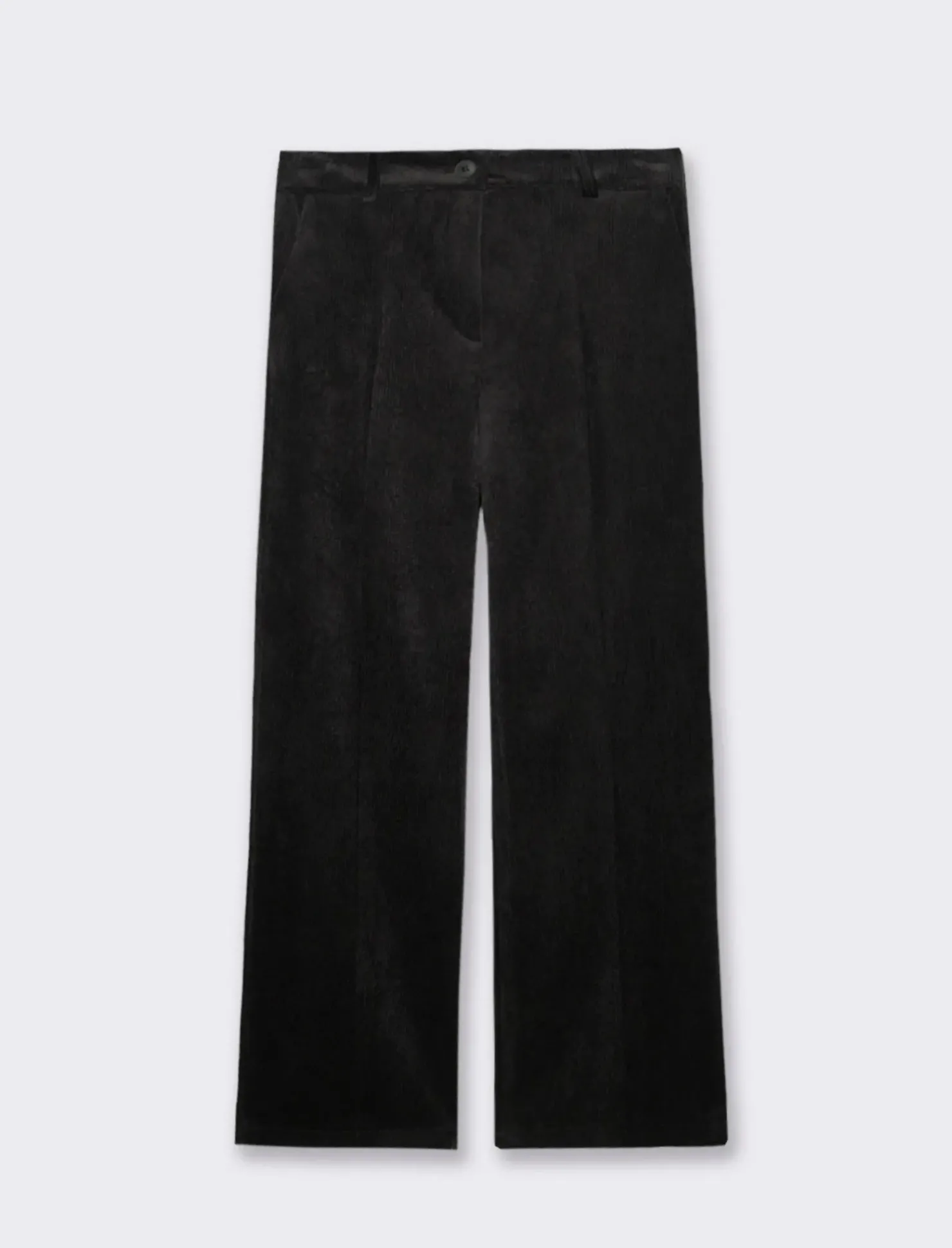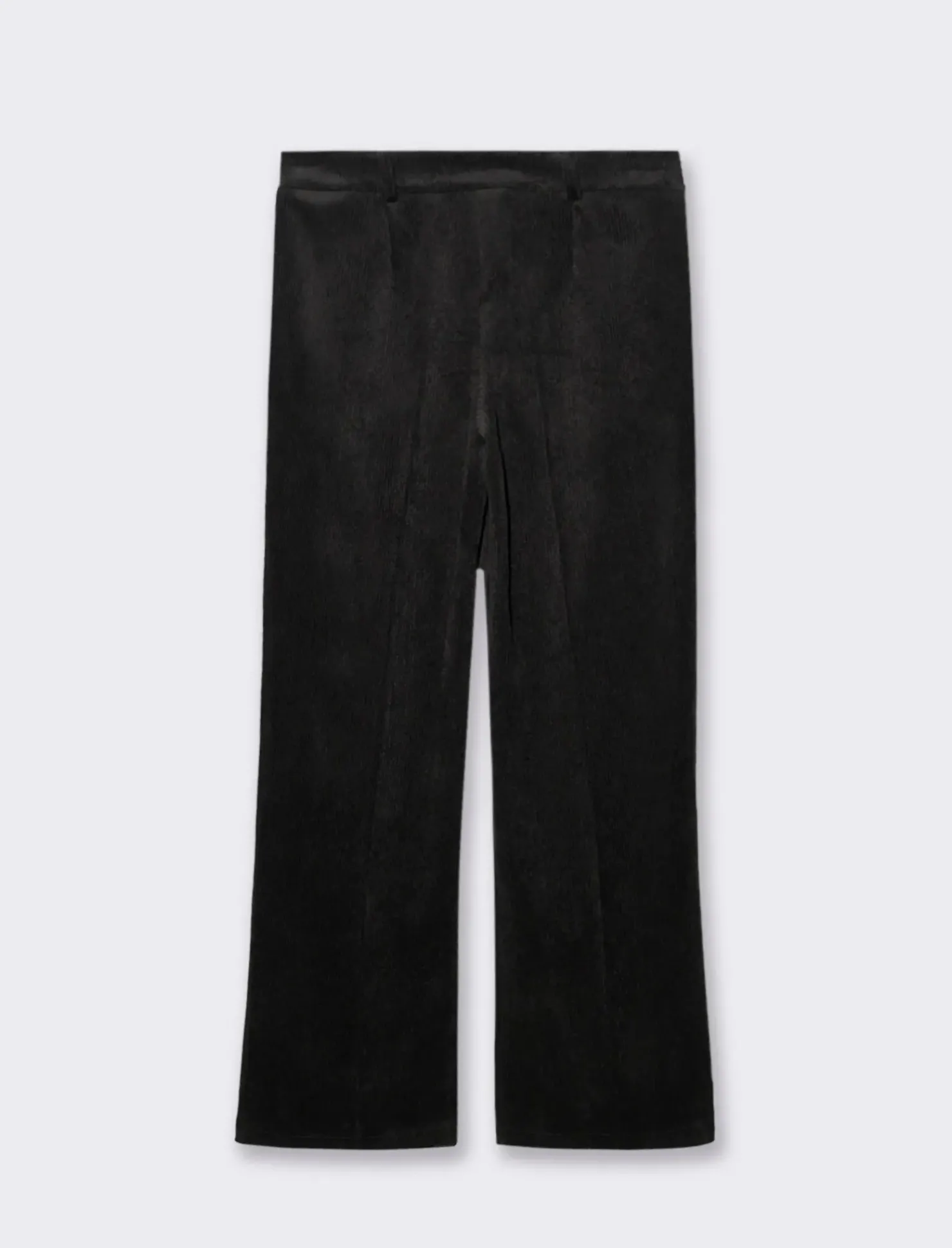 Pantalone a vita alta, realizzato in un tessuto effetto velluto che aggiunge un tocco di lusso e raffinatezza al tuo look. Questo pantalone è caratterizzato da coste verticali, che non solo conferiscono una texture interessante, ma anche un effetto snellente e allungante per la figura.La vita alta offre una vestibilità comoda e sicura, mettendo in risalto la silhouette e aggiungendo un tocco di eleganza. Il tessuto effetto velluto è morbido e piacevole al tatto, perfetto per le stagioni più fresche. Questi pantaloni sono ideali per essere abbinati a una camicia elegante, un maglione aderente o una blusa sofisticata. Il prodotto è di colore Nero