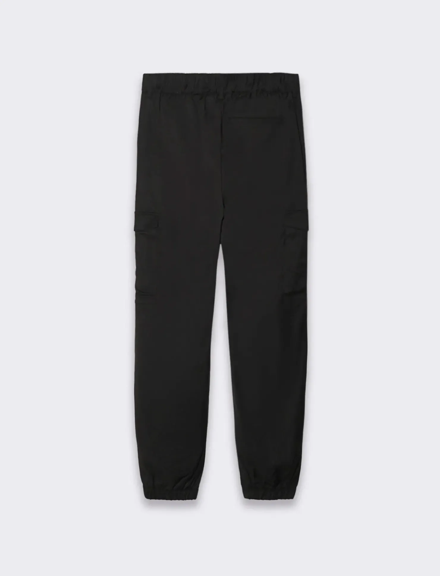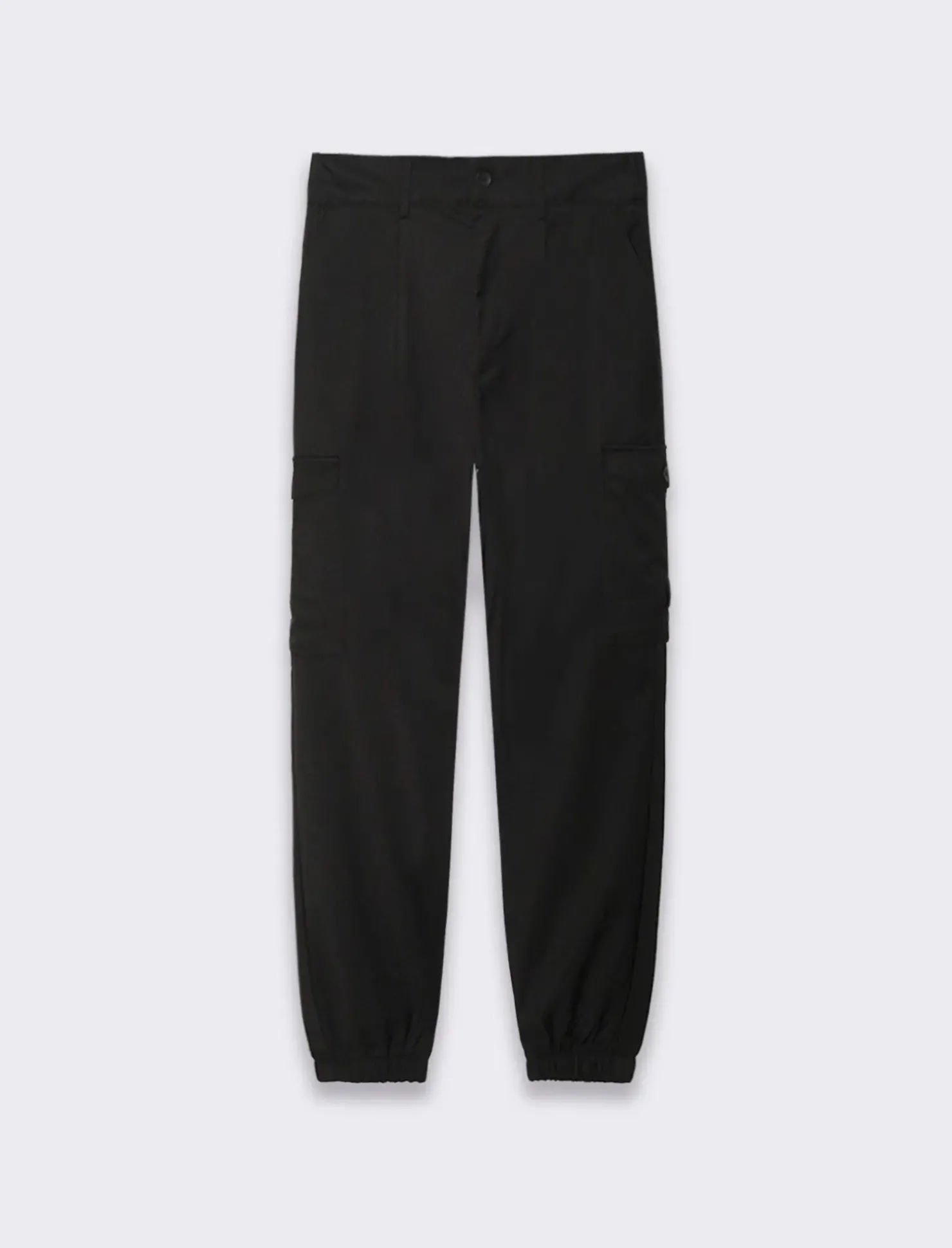 Pantaloni cargo con vita semi elasticizzata, comodi e pratici per ogni occasione. Con pinces sul davanti e tasche laterali con patta, offrono un look casual ma curato. Il dettaglio della ditasca a filetto posteriore aggiunge un tocco di originalità. L’orlo elasticizzato assicura una vestibilità perfetta, mentre la chiusura con bottone completa il design di questi versatili pantaloni chino. Il prodotto è di colore Nero