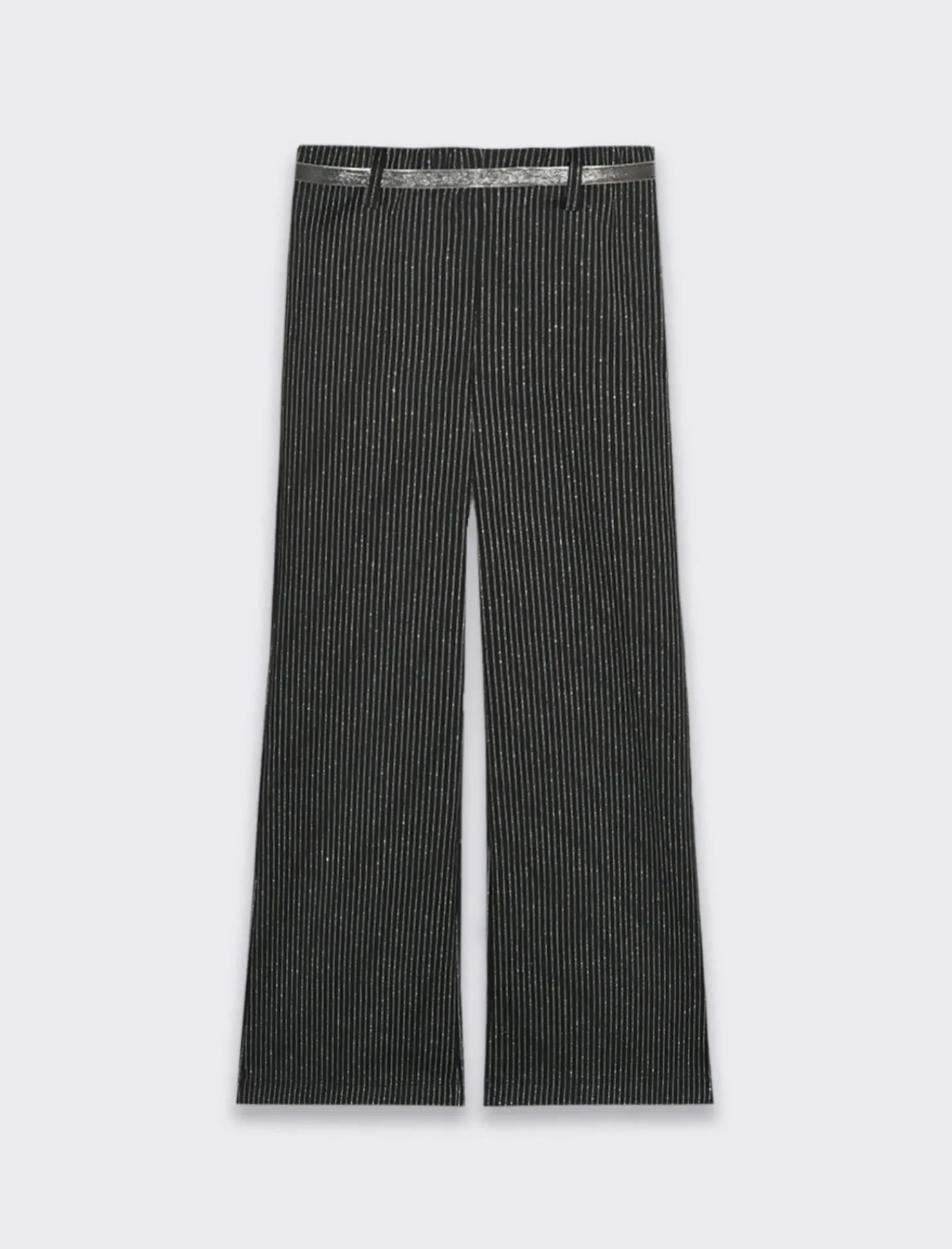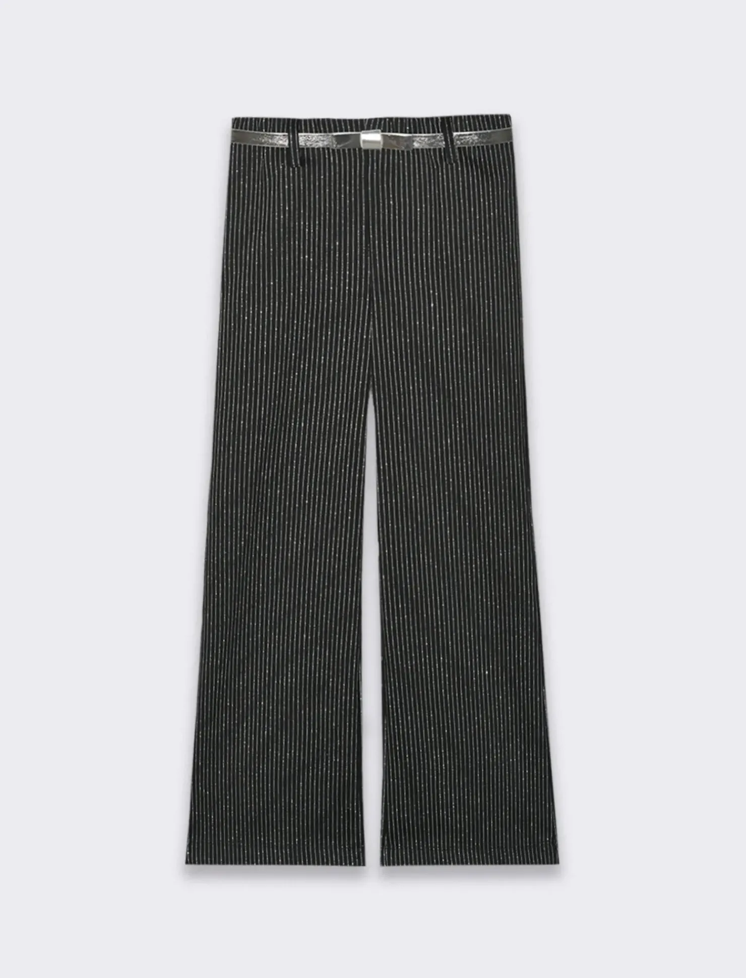 Pantaloni da bambina in tessuto elastico gessato, dalla vestibilità ampia con elastico in vita e cintura decorativa a fiocco. Il prodotto è di colore Nero