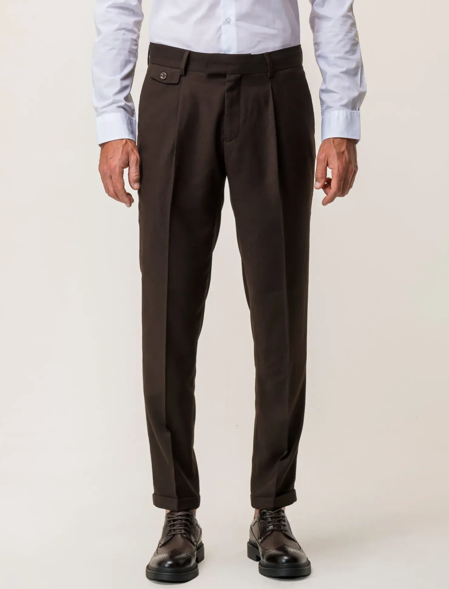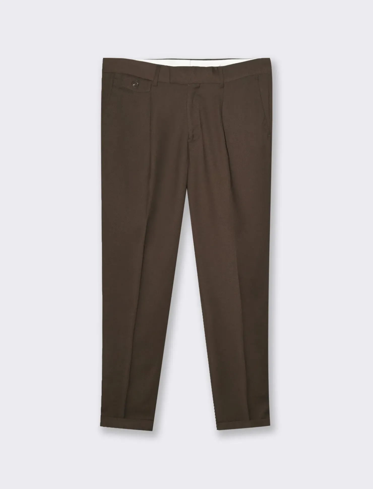 Pantaloni da completo formal fit ideali per un look elegante e professionale. Realizzati in tessuto diagonale di alta qualità, con tasche anteriori e dettaglio di tasche a filetto posteriori. La chiusura anteriore con cerniera e bottone garantisce comodità e praticità. Il prodotto è di colore Moro