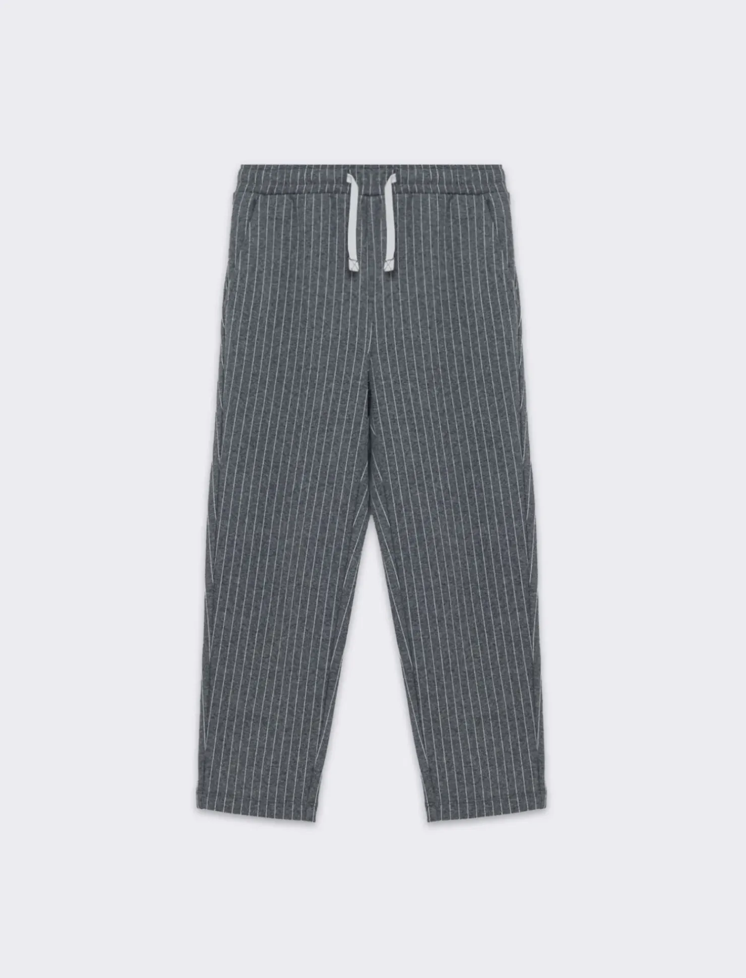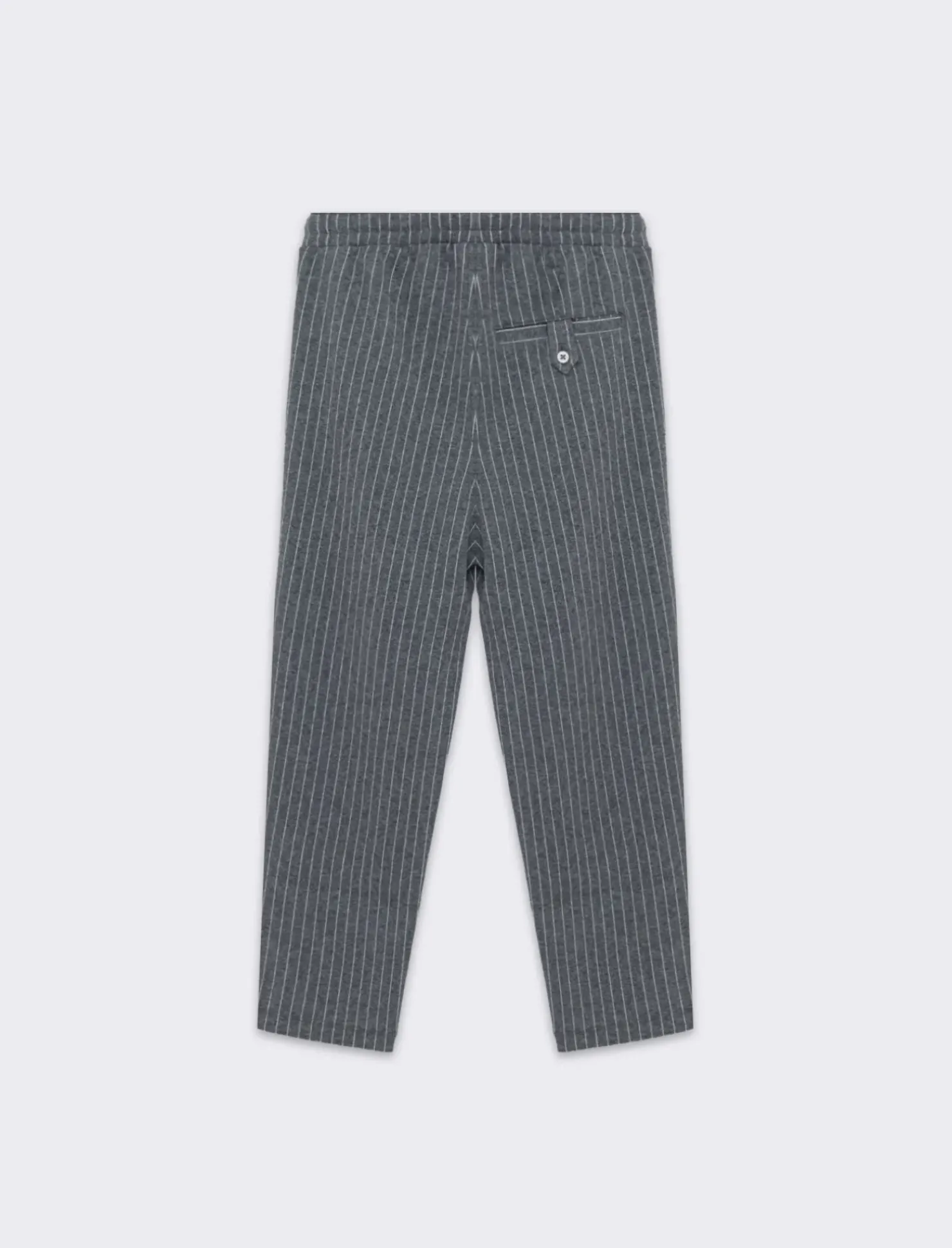 Pantaloni da bambino in tessuto a maglia modello jogger a fantasia gessato con coulisse in vita, comodo ed elegante per le occasioni speciali. Il prodotto è di colore Grigio