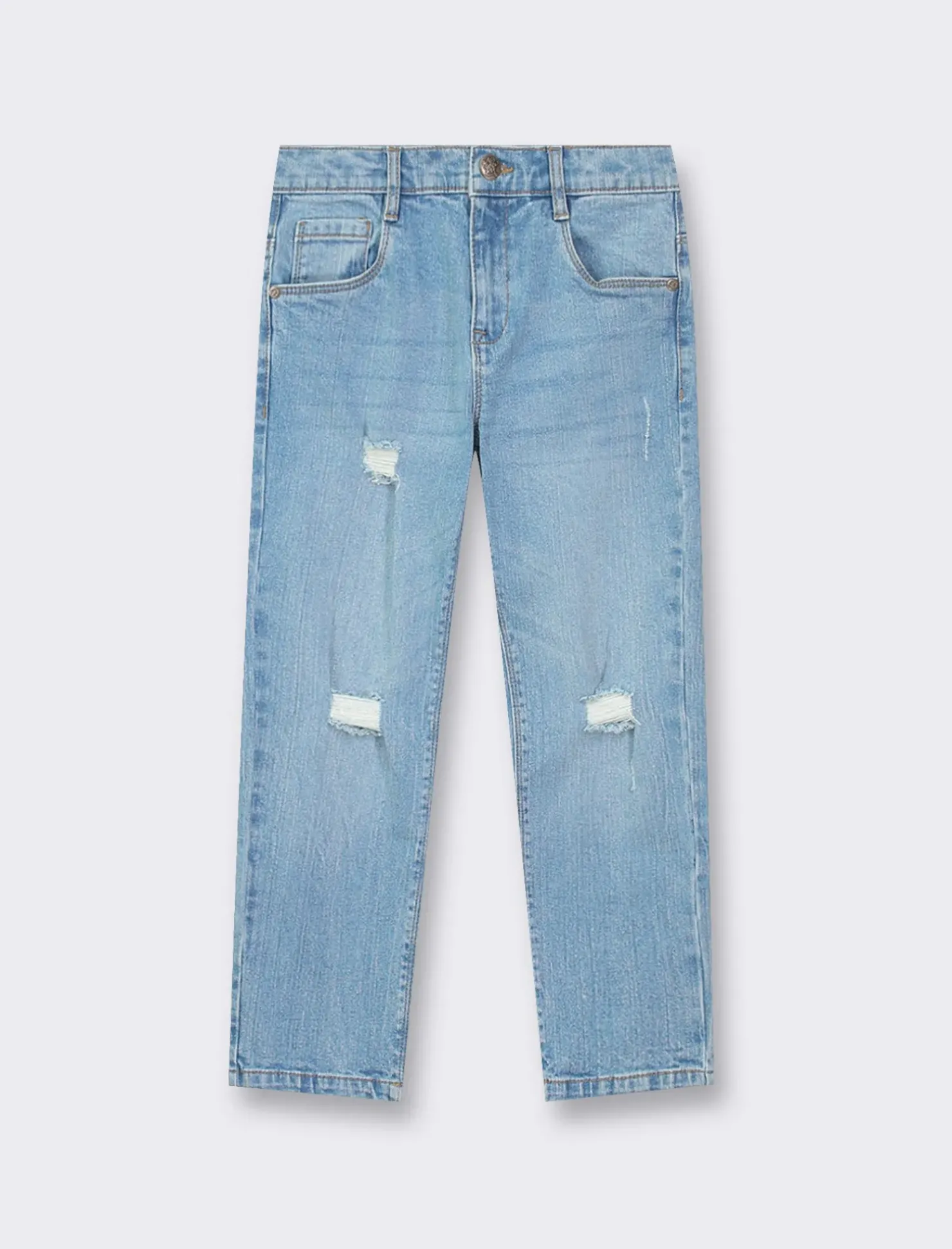 Pantaloni in denim 5 tasche per bambini, dal design regular fit e con elastico regolabile in vita. Con le rotture frontali, questi pantaloni donano uno stile sportivo e alla moda ai più piccoli. Ideali per un look casual e comodo, perfetti per ogni occasione. Il prodotto è di colore Denim chiaro