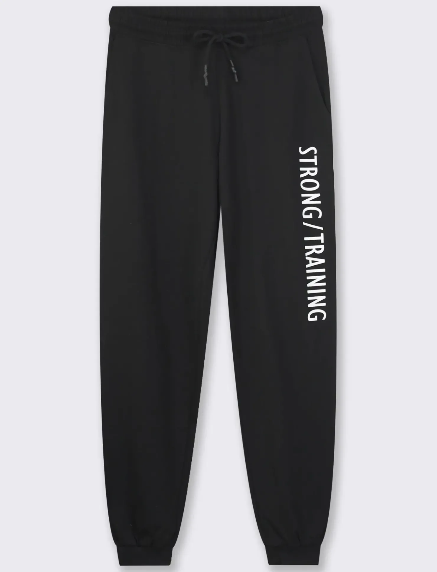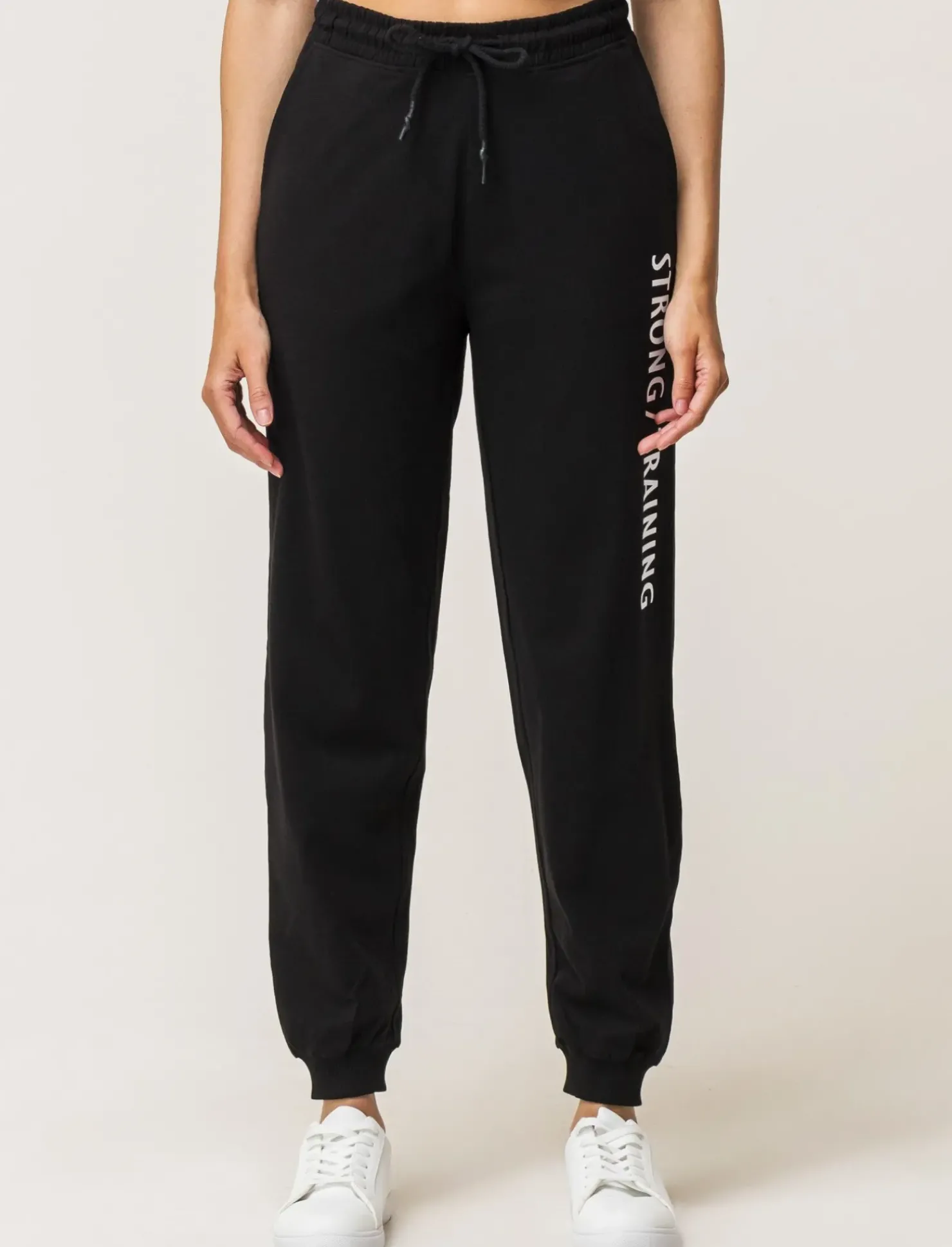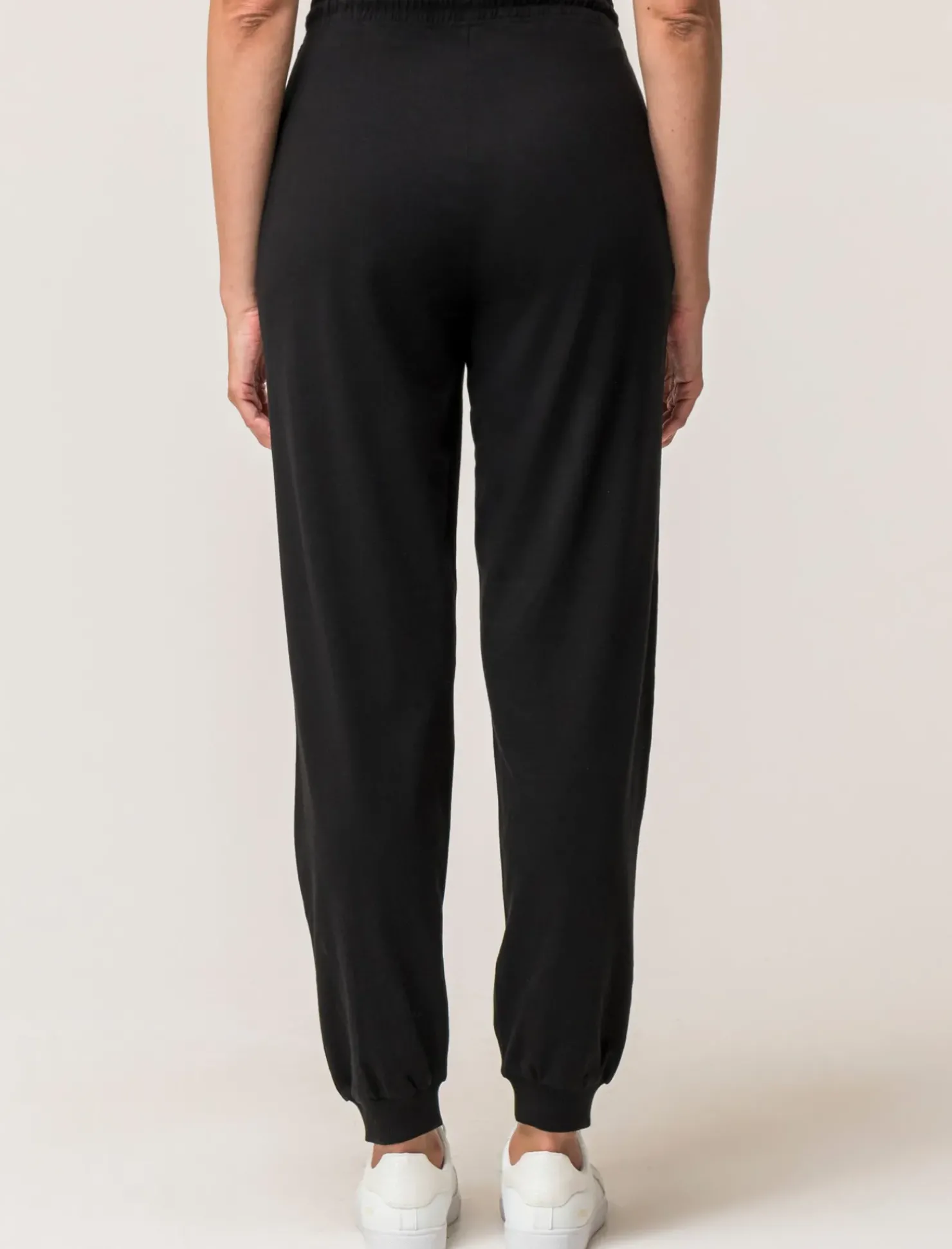 Pantaloni jogger in jersey di cotone per donna, comodi e alla moda. Con laccetto in vita e dettagli bustino e caviglia in costina, sono perfetti per un look casual ma curato. La stampa laterale aggiunge un tocco di originalità, disponibili in varie tonalità per soddisfare ogni stile. Il prodotto è di colore Nero