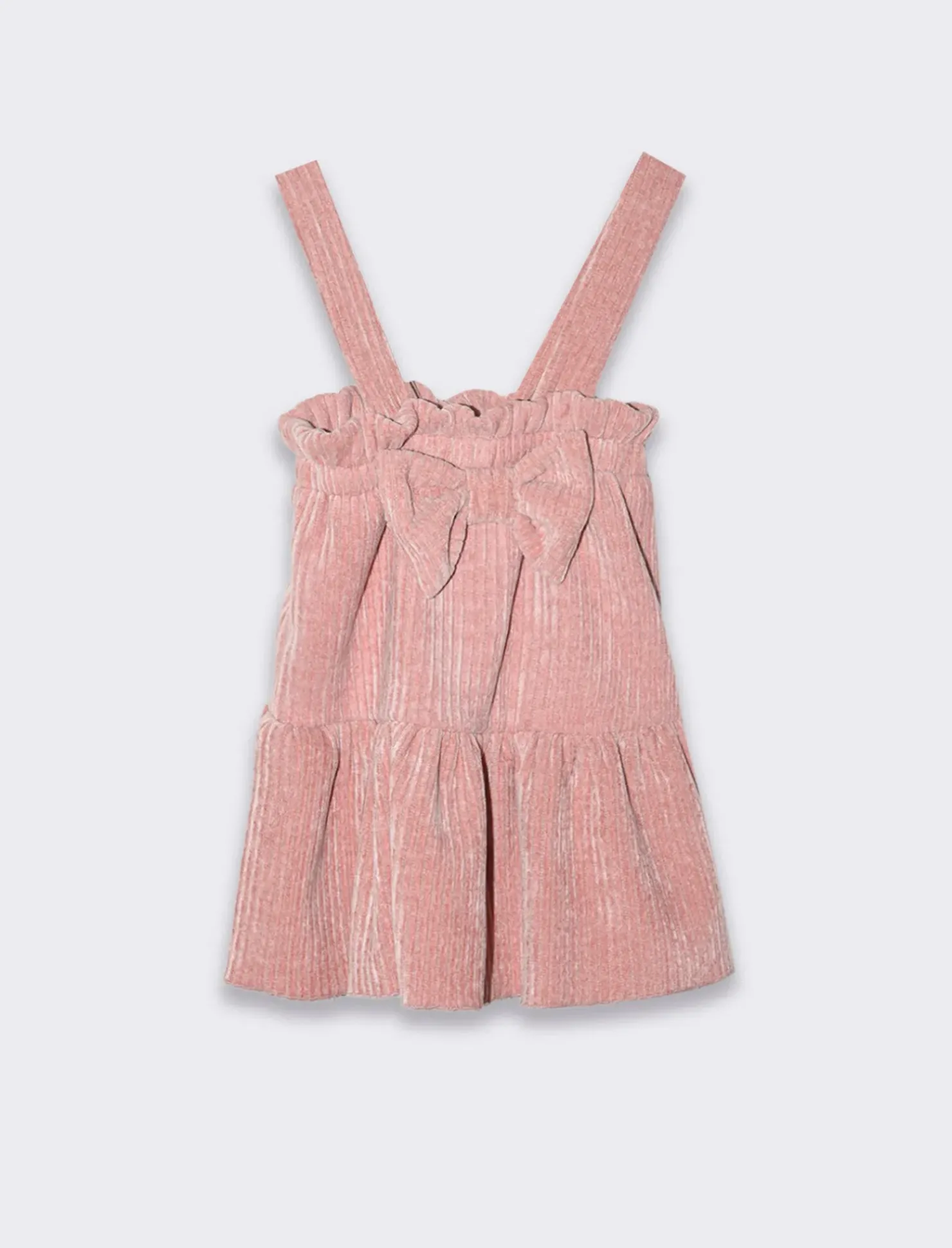 Salopette da neonata, tessuto in velluto a coste larghe elasticizzato. Gonna a balze e fiocco decorativo in vita.Graziosa ed elegante per look invernali. Il prodotto è di colore Rosa