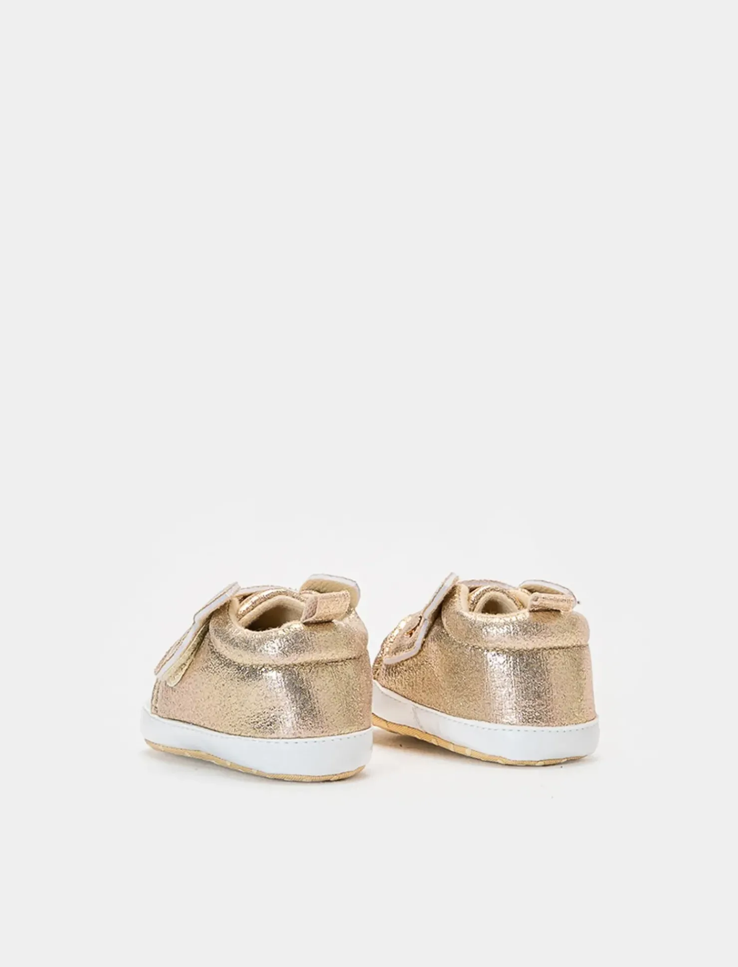 Scarpa neonata unicorno: realizzata in morbido tessuto sintetico dorato, questa adorabile scarpa presenta delle simpatiche applicazioni a forma di unicorno. Il fondo antiscivolo garantisce la massima sicurezza durante i primi passi del tuo piccolo. Il prodotto è di colore Oro