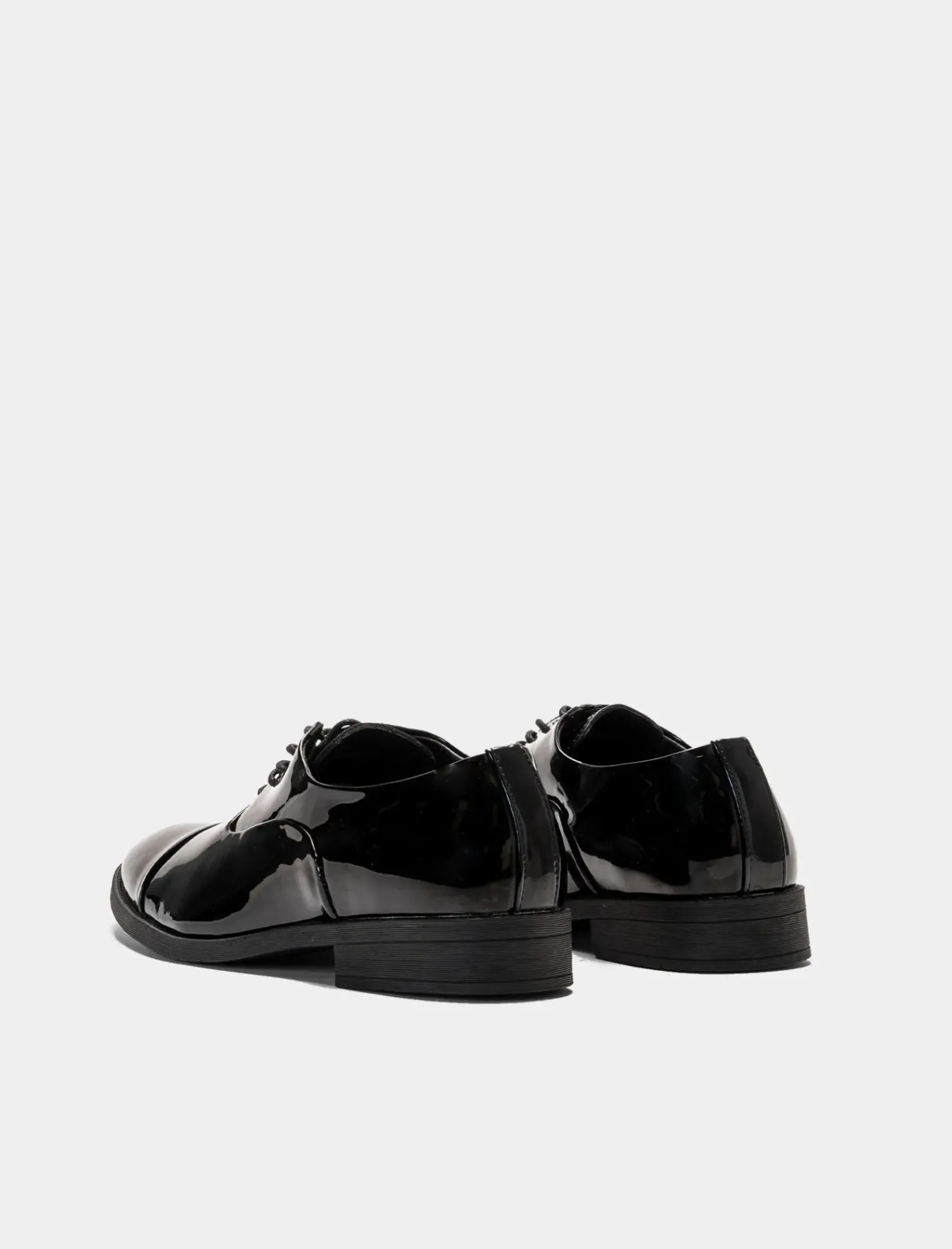 Scarpa stringata in vernice nera con doppie cuciture sulla punta. Realizzata in poliuretano lucido, ideale per un look elegante e sofisticato. Perfetta da abbinare a un outfit formale o casual chic. Un must-have per chi ama distinguersi con stile e classe. Il prodotto è di colore Nero