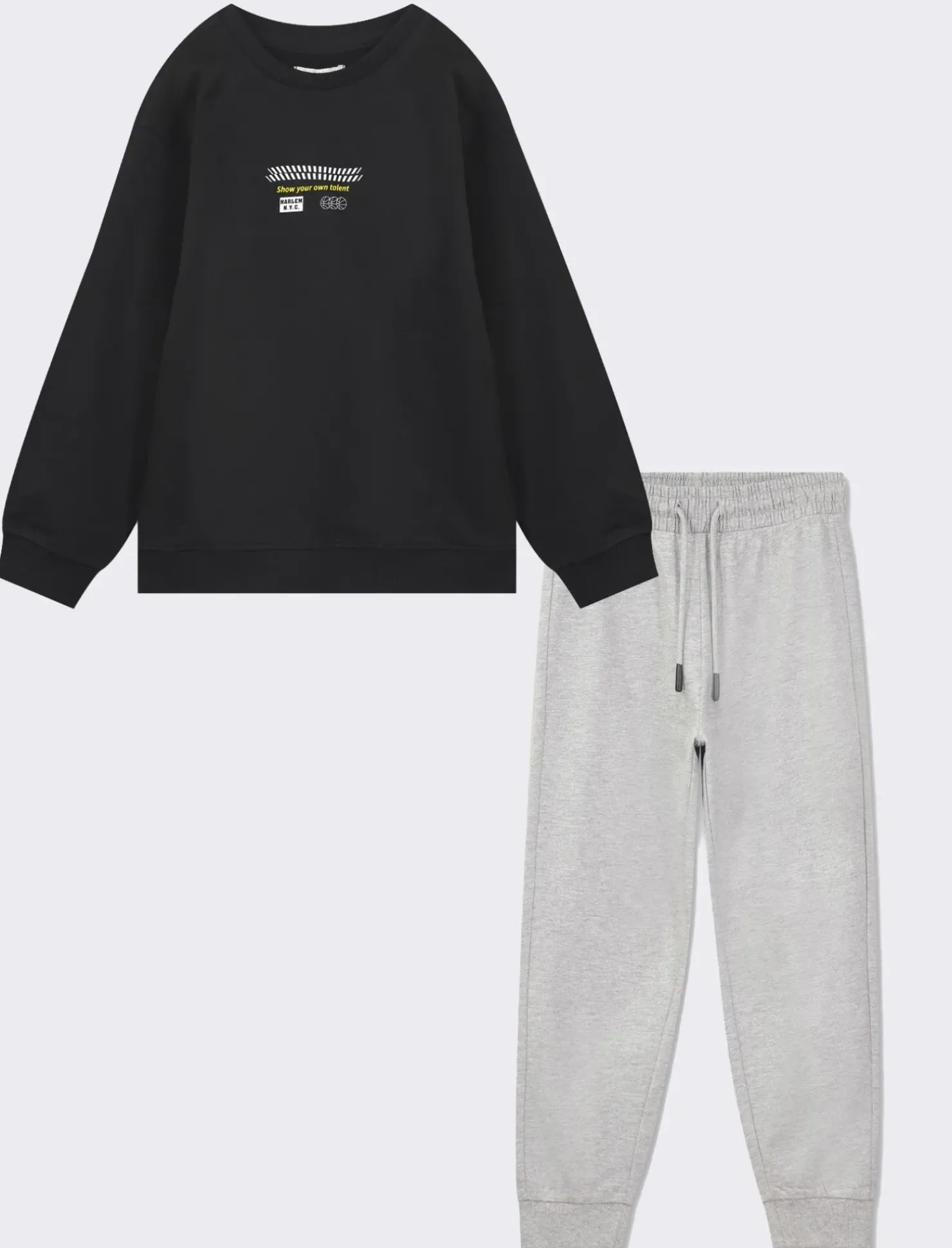 Tuta in felpa per bambino, un set composto da una felpa girocollo con una maxi stampa sul retro e un pantalone jogger con coulisse, entrambi a tinta unita. Lo stile comodo e casual di questo outfit lo rende perfetto per l’uso quotidiano dei più piccoli. Il prodotto è di colore Nero