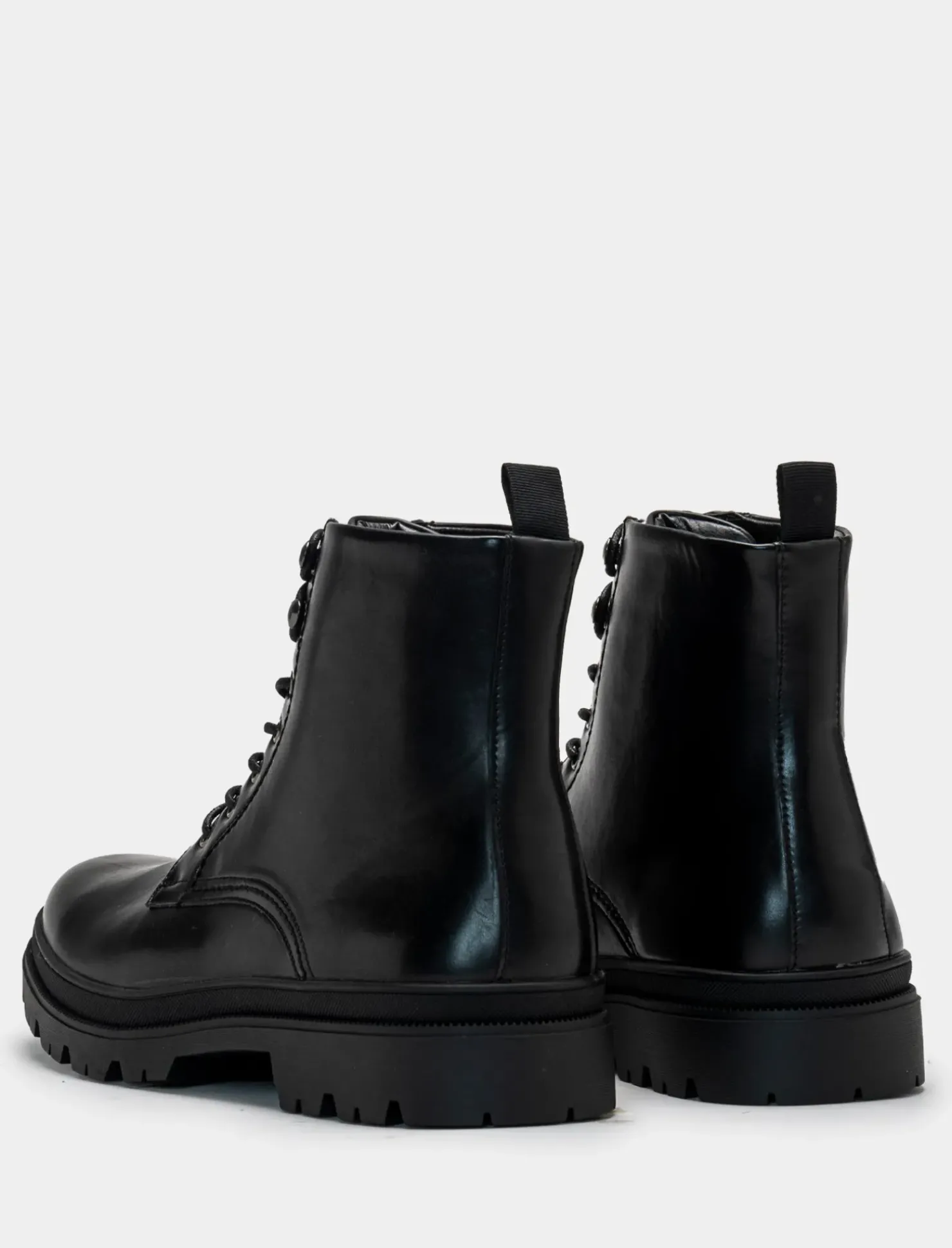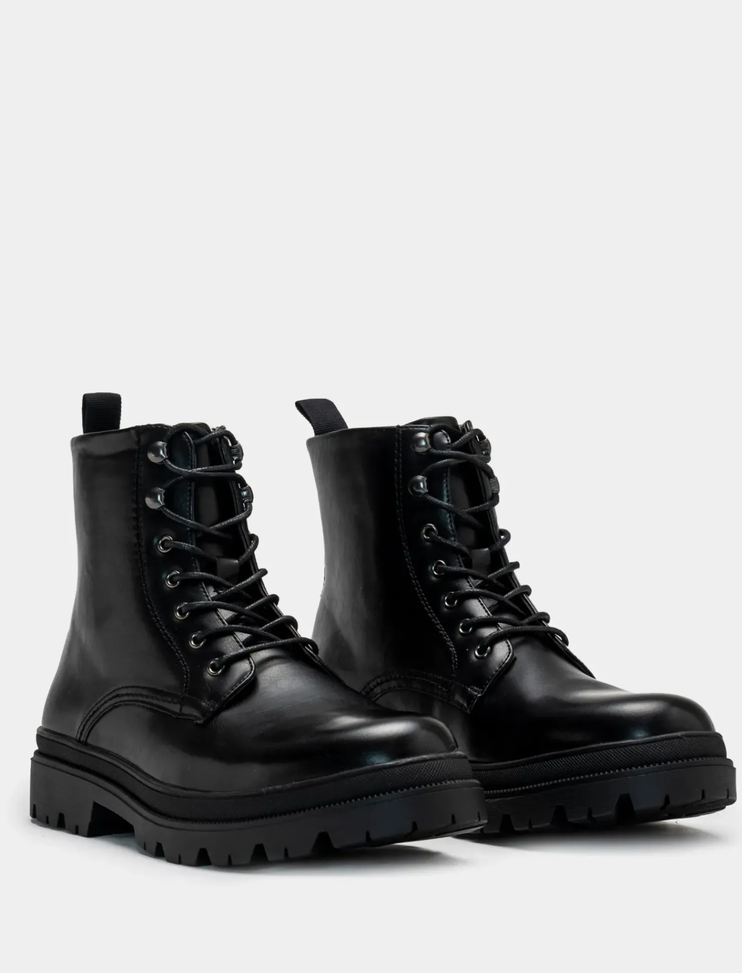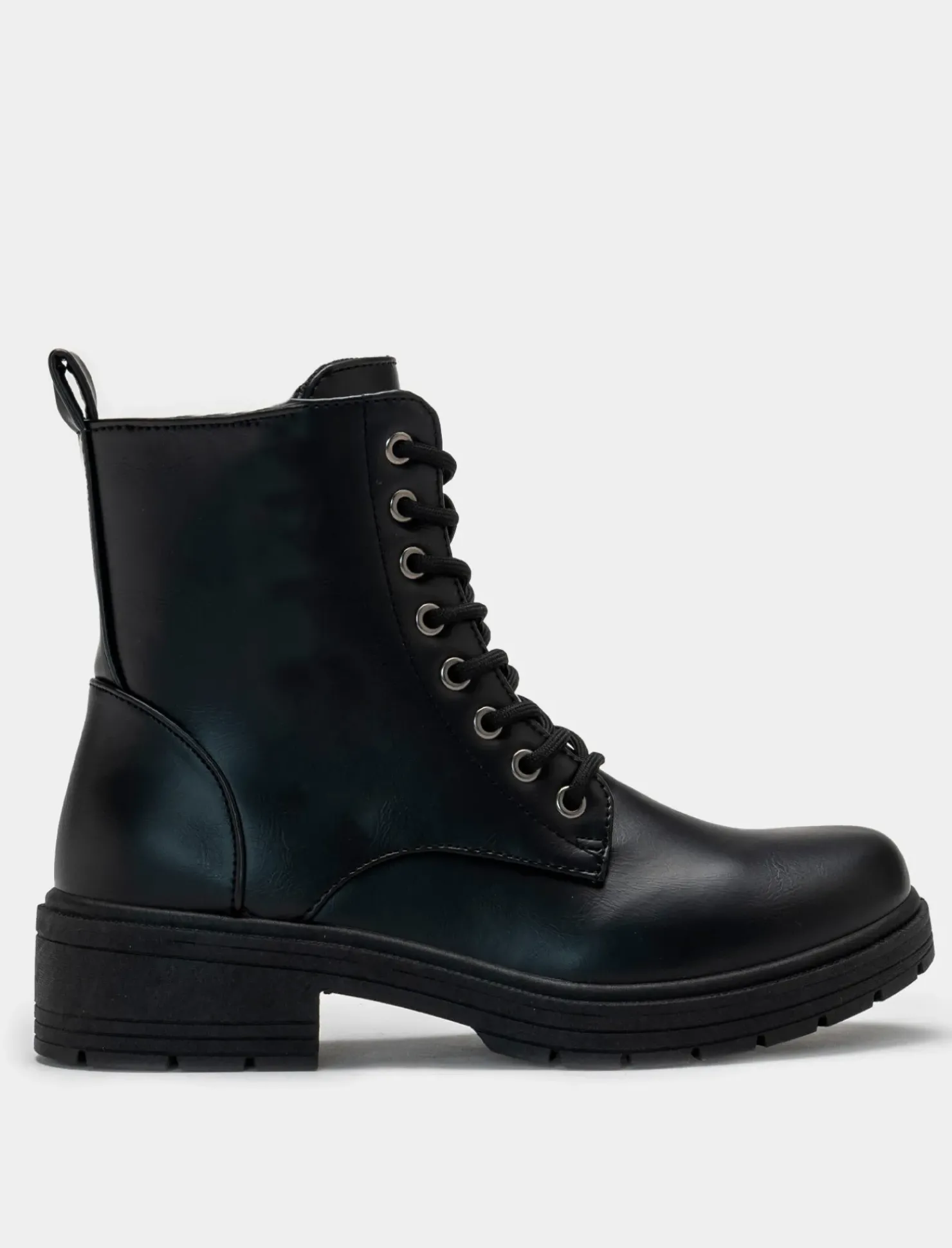 Stivale stringato in poliuretano nero con fondo roccia. Ideale per un look urbano e trendy, perfetto da abbinare a jeans o leggings per un outfit casual ma alla moda. La suola robusta assicura comfort e stabilità in ogni passo, mentre il design stringato conferisce un tocco di grinta e originalità. Il prodotto è di colore Nero