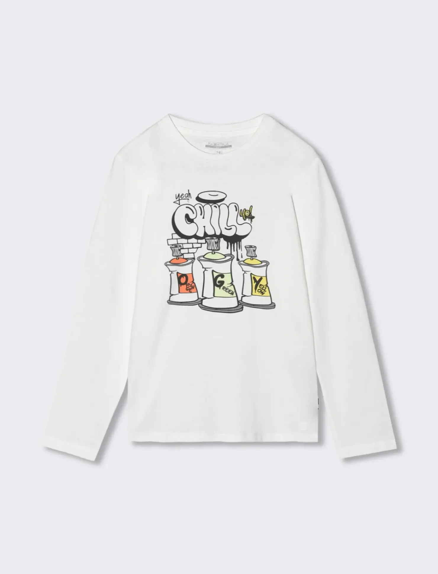 T-shirt a manica lunga da bambino in morbido cotone, perfetta per il tempo libero. Disponibile in 4 vivaci modelli colorati con stampa divertente sul davanti. Un capo comodo e alla moda per i più piccoli, ideale per giocare e divertirsi in totale libertà. Il prodotto è di colore Bianco sporco
