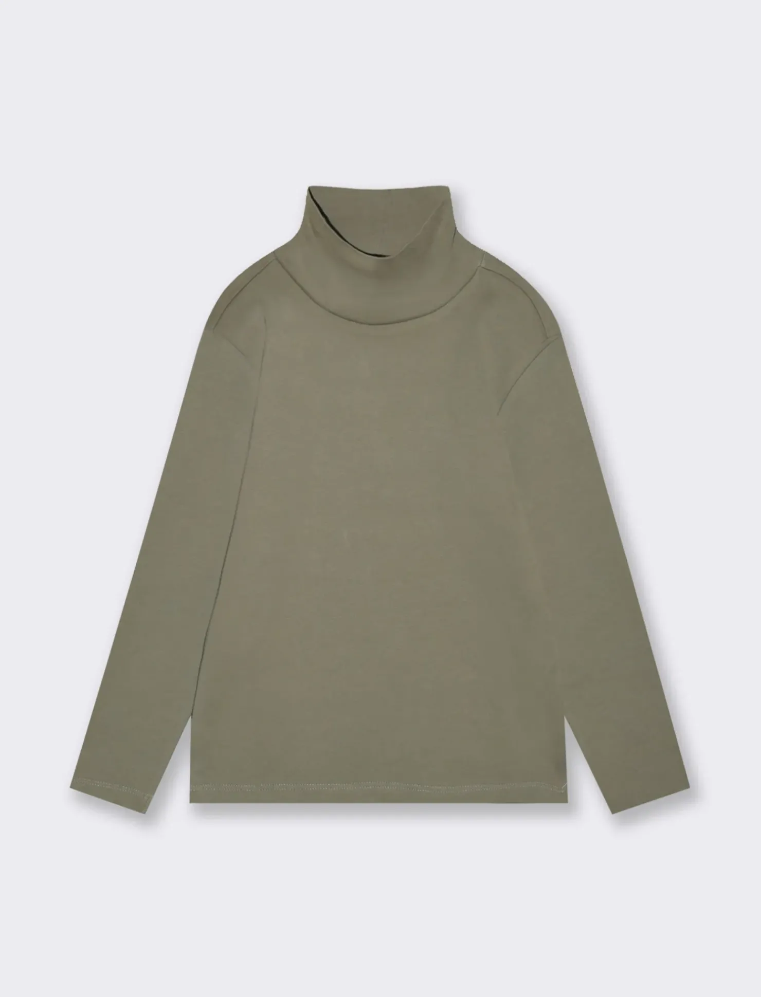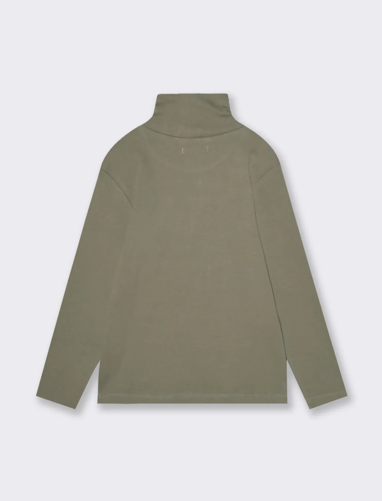 T-shirt da bambino modello collo alto in caldo cotone. Tinta unita e ricamo in tono. Ideale per le giornate più fredde. Il prodotto è di colore Verde militare
