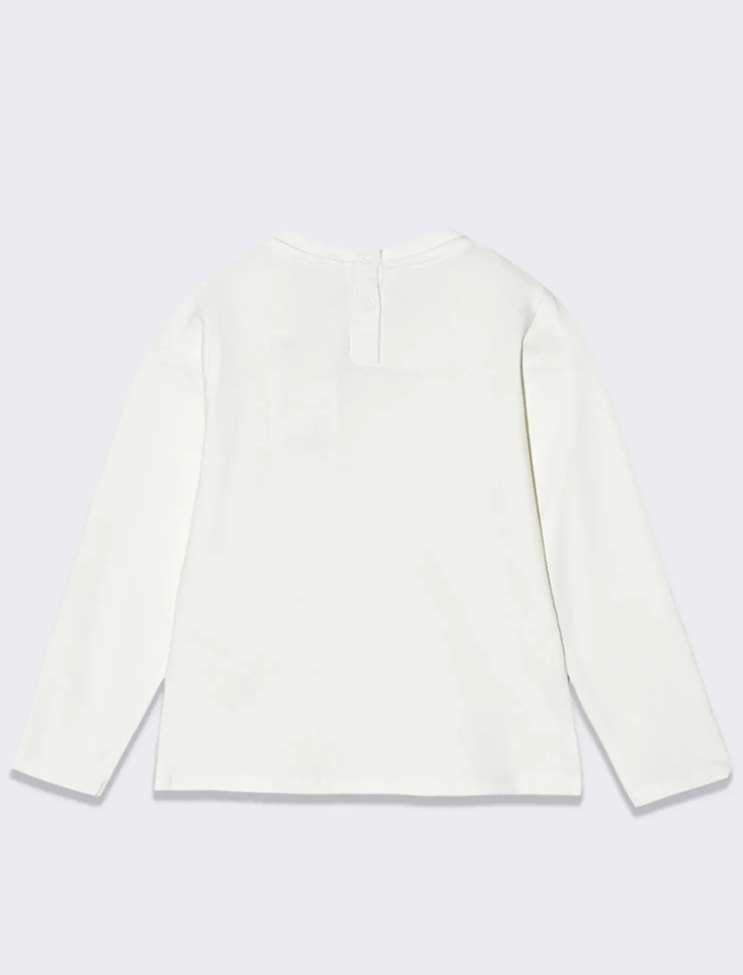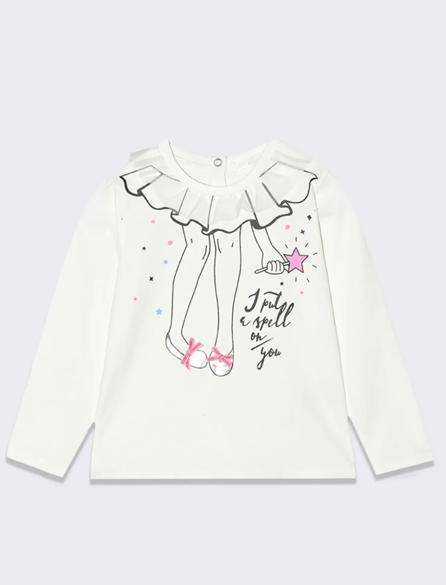 MAGLIETTA IN JERSEY CON APPLICAZIONE DI TULLE AL COLLO, IDEALE PER ABBINAMENTI ROMANTICI E CHIC. STAMPA FRONTALE CON ELEMENTI BRILLANTI. Il prodotto è di colore Bianco panna