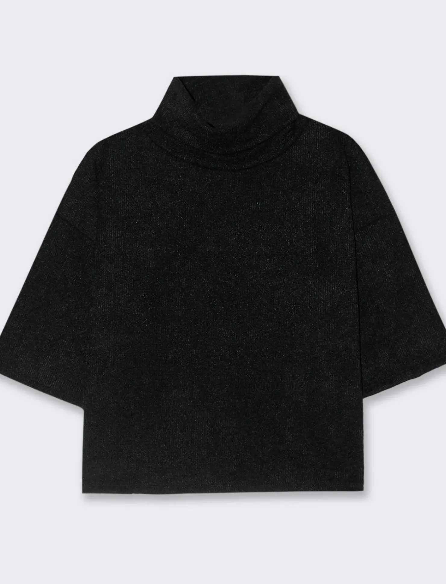 T-shirt a coste che combina eleganza e comfort. Questa maglia ha un design a coste, che le conferisce una texture interessante e un aspetto raffinato. Le maniche sono a 3/4, offrendo una copertura che è perfetta per le mezze stagioni, mentre il collo alto aggiunge un tocco di sofisticatezza e calore. à un capo versatile che può essere abbinato sia a look casual che più formali, ideale per chi cerca uno stile semplice ma chic. Il prodotto è di colore Nero