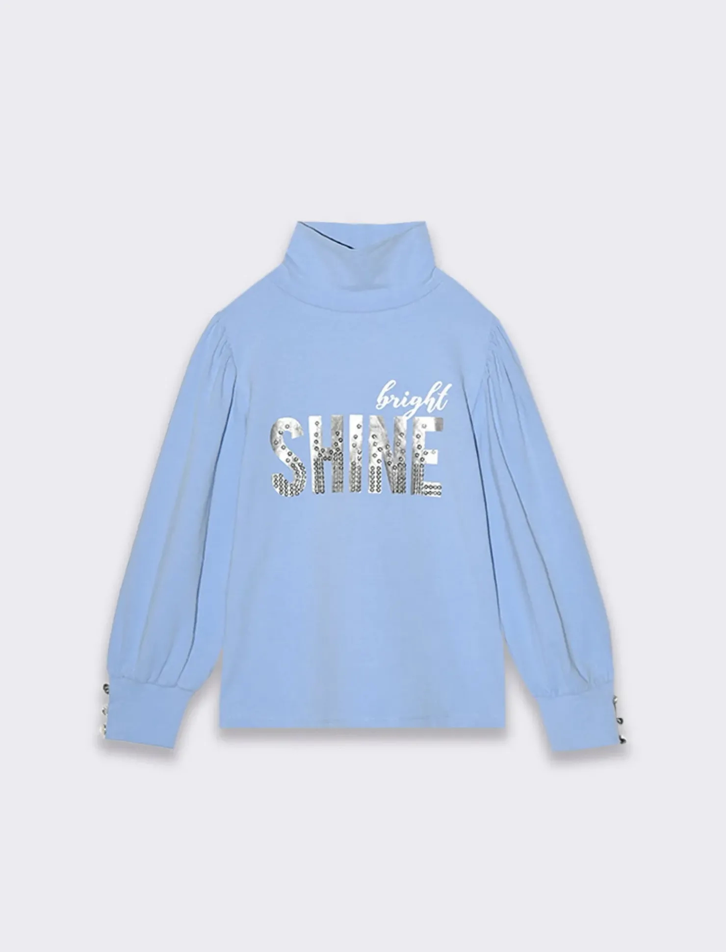 Lupetto in caldo cotone per bambina, realizzato in morbido cotone elasticizzato per un comfort ottimale. La t-shirt presenta una vestibilità regular, maniche a palloncino e un ricamo frontale decorato con paillettes. Ideale per un look trendy e confortevole per le piccole fashioniste di casa. Il prodotto è di colore Azzurro