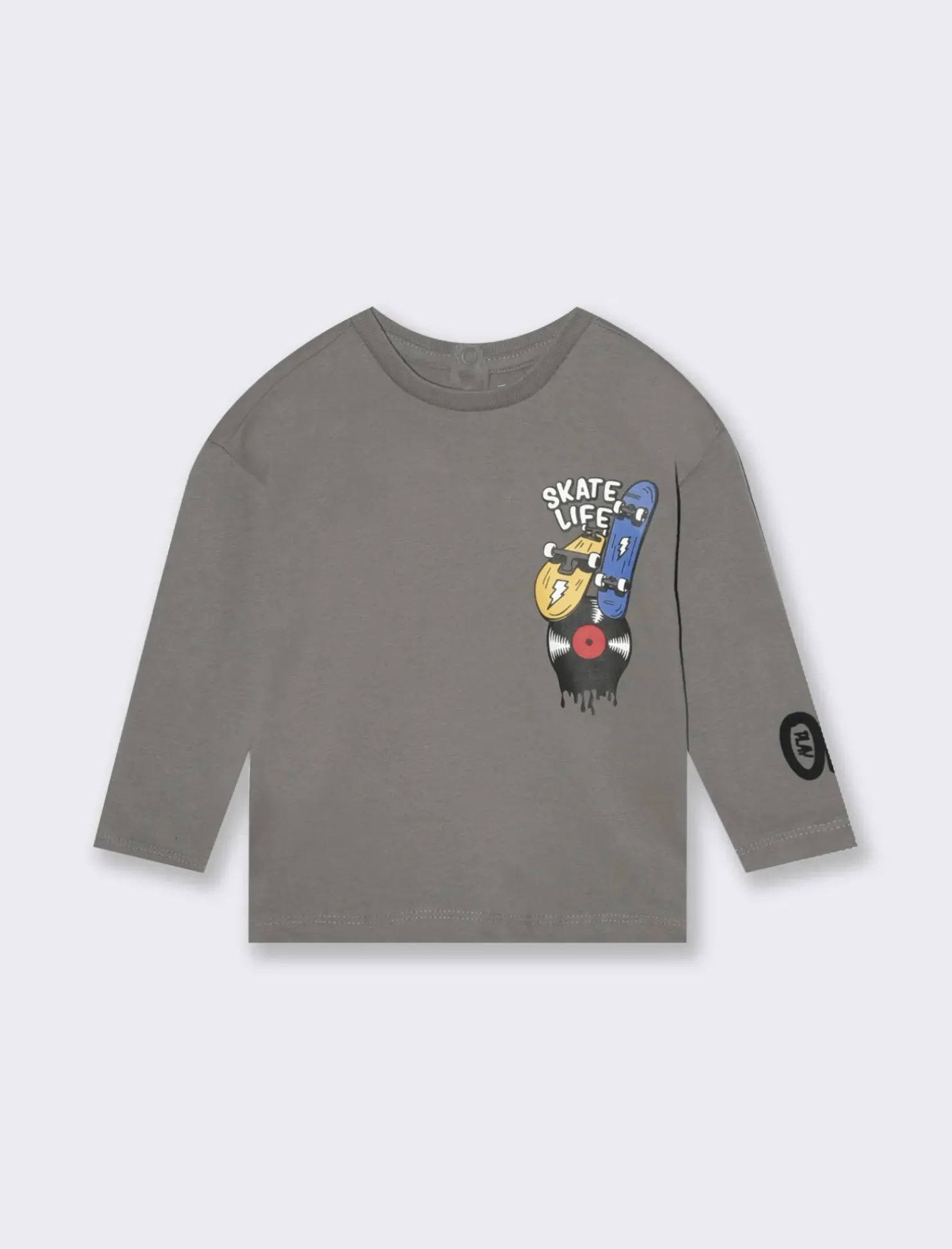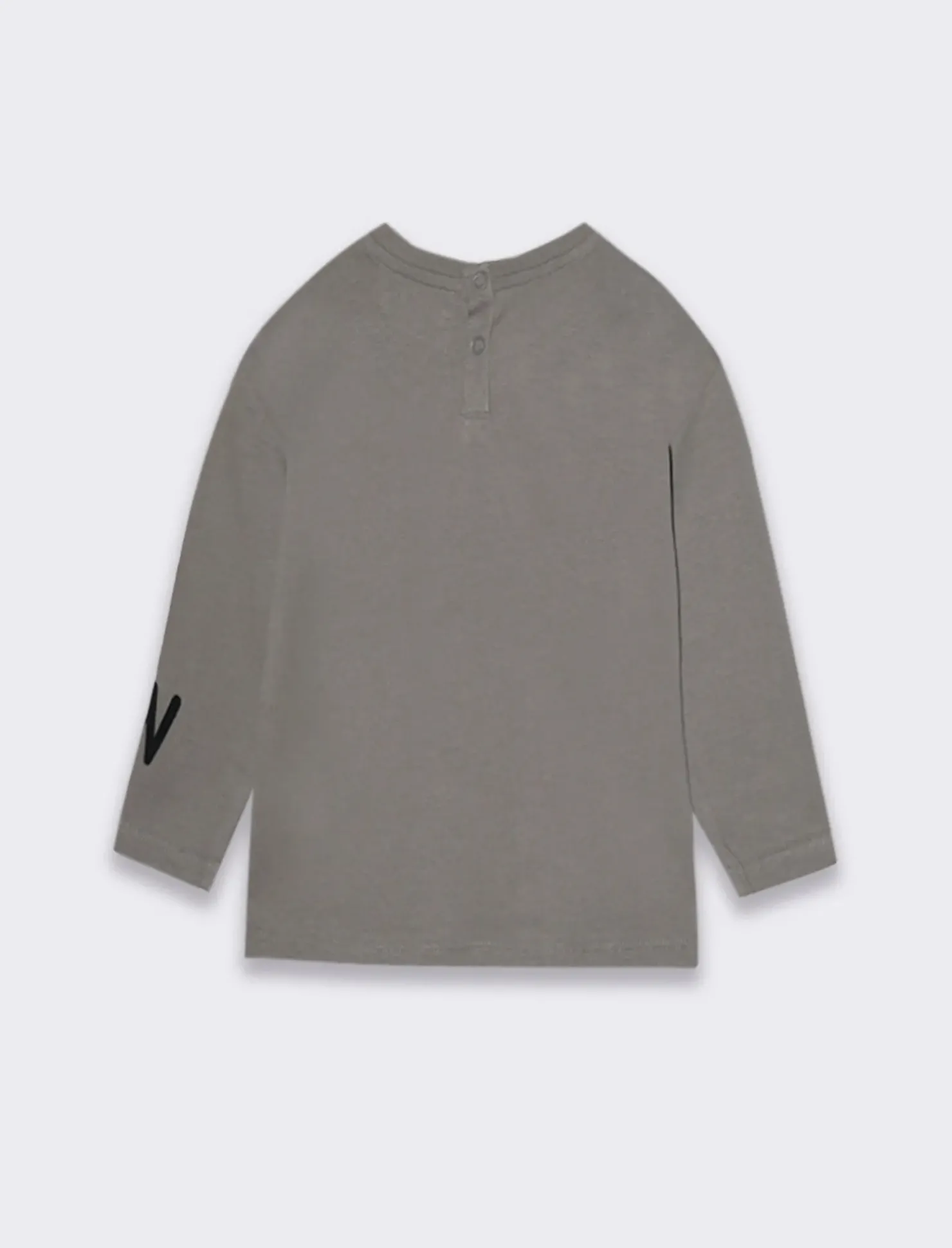 MAGLIETTA GIROCOLLO E MANICA LUNGA, CON STAMPA FRONTALE E PICCOLA STAMPA FLOCK SULLA MANICA. Il prodotto è di colore Grigio piombo