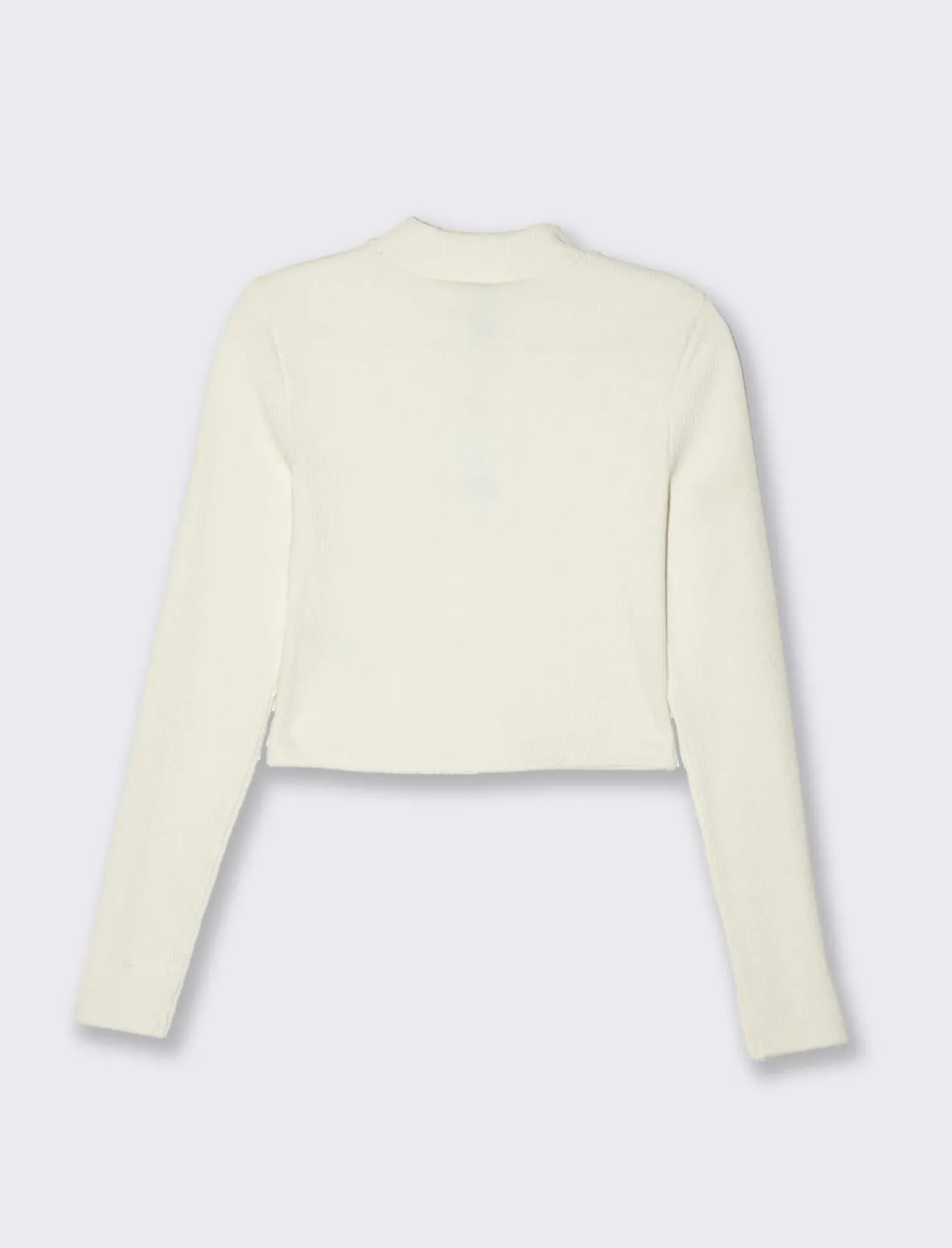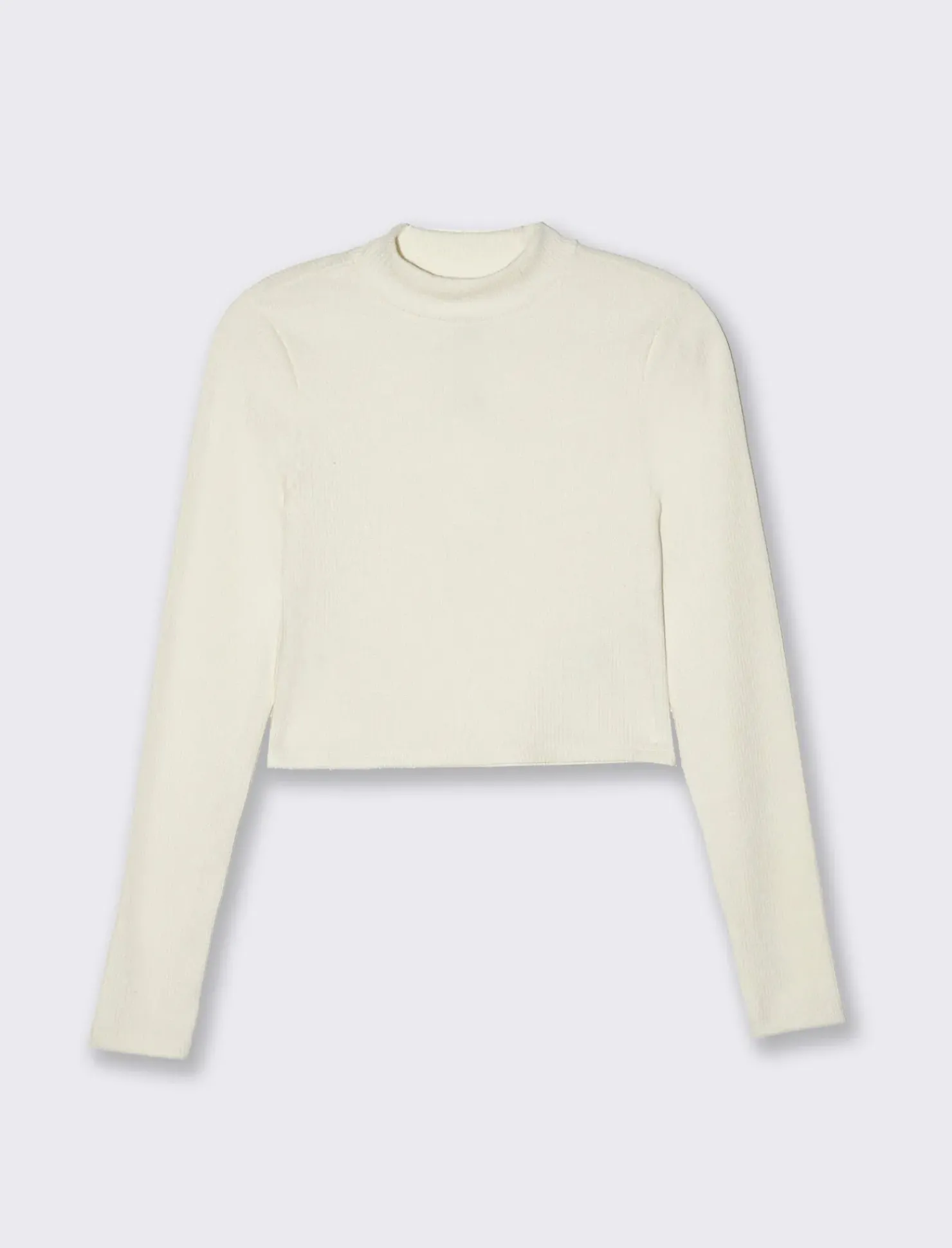 Piazza Italia T-shirt crop manica lunga con mezzo collo lavorazione a coste strette – Avorio New