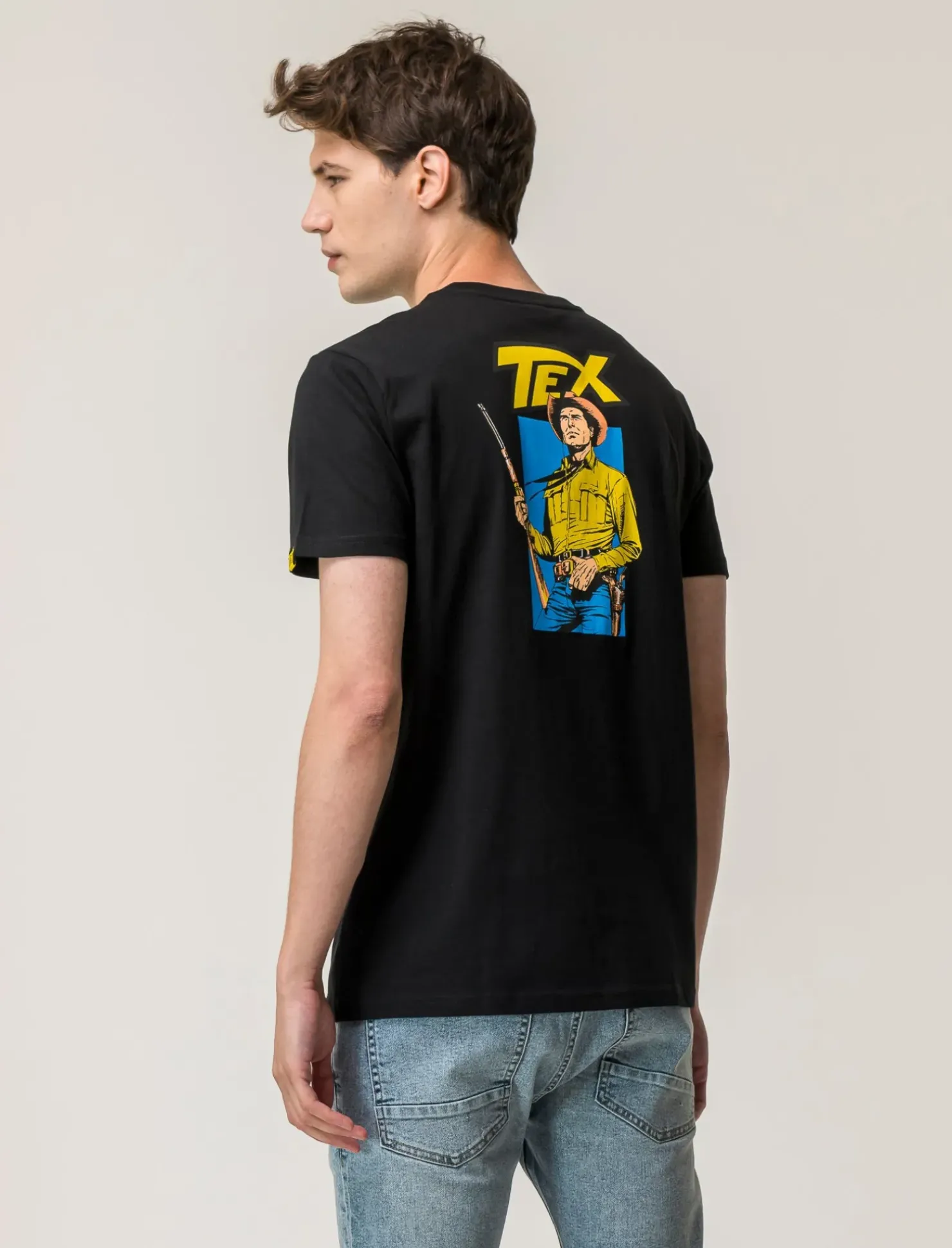 T-shirt girocollo da uomo con stampa ispirata a Tex Willer, l’iconico personaggio dei fumetti western. Realizzata in morbido jersey di cotone, questa maglietta a maniche corte e vestibilità regular fit è perfetta per un look casual e originale. La stampa di Tex Willer sul davanti e sul retro conferisce un tocco di personalità e stile unico a questo capo. Il prodotto è di colore Nero