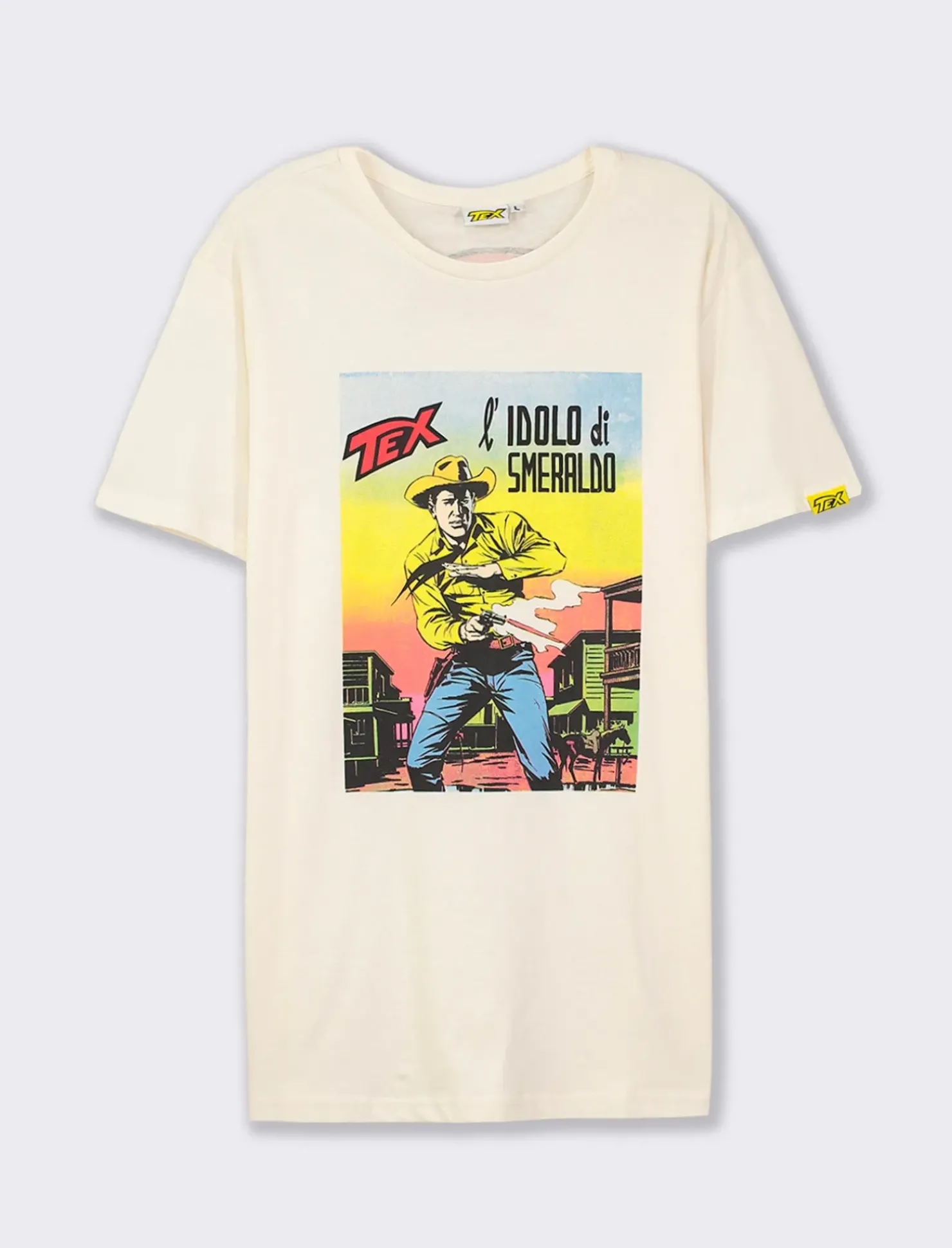 T-shirt girocollo da uomo con stampa ispirata a Tex Willer, l’iconico personaggio dei fumetti western. Realizzata in morbido jersey di cotone, questa maglietta a maniche corte e vestibilità regular fit è perfetta per un look casual e originale. La stampa di Tex Willer sul davanti e sul retro conferisce un tocco di personalità e stile unico a questo capo. Il prodotto è di colore Bianco sporco
