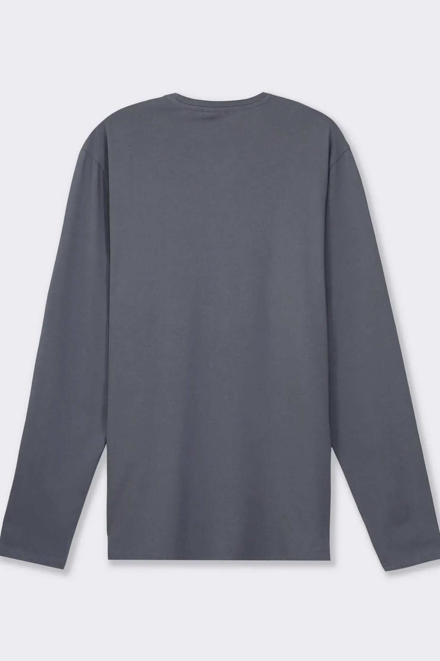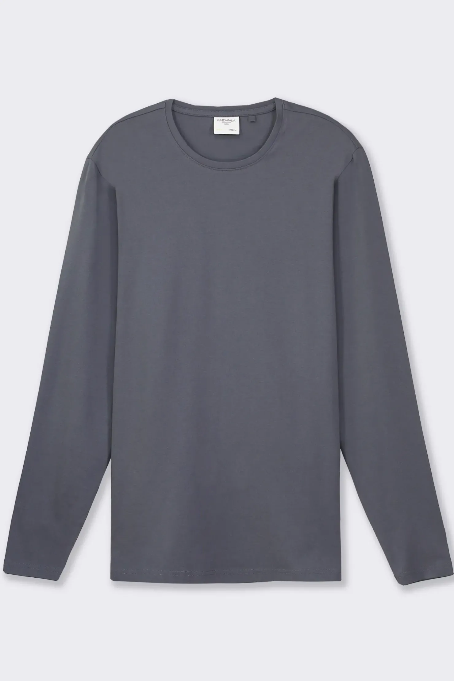 T-shirt girocollo maniche lunghe slim fit in jersey di cotone elasticizzato. Ideale per un look casual e confortevole, perfetta da indossare in ogni occasione. Il tessuto elasticizzato garantisce una vestibilità aderente ma comoda, valorizzando la silhouette maschile. Un capo essenziale nel guardaroba di ogni uomo moderno. Il prodotto è di colore Avion