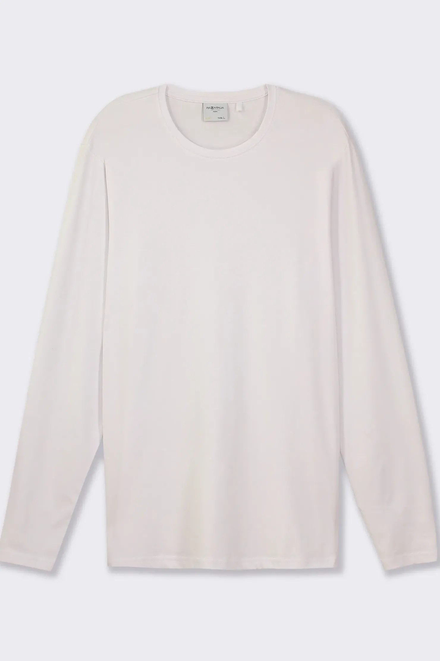 T-shirt girocollo maniche lunghe slim fit in jersey di cotone elasticizzato. Ideale per un look casual e confortevole, perfetta da indossare in ogni occasione. Il tessuto elasticizzato garantisce una vestibilità aderente ma comoda, valorizzando la silhouette maschile. Un capo essenziale nel guardaroba di ogni uomo moderno. Il prodotto è di colore Bianco