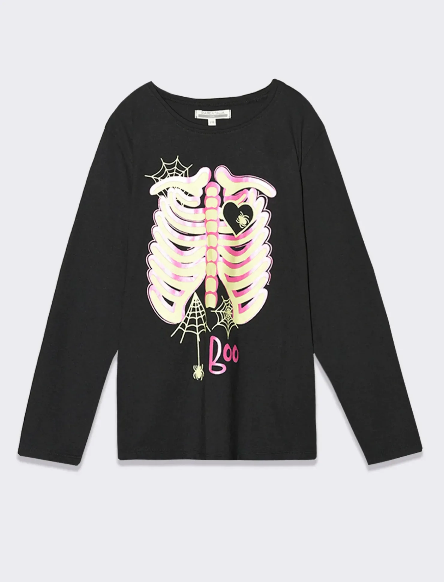 T-shirt da bambina 100% cotone con ali in tulle stampato con motivo Halloween. Stampa fluorescente e colorata sul davanti Il prodotto è di colore Nero