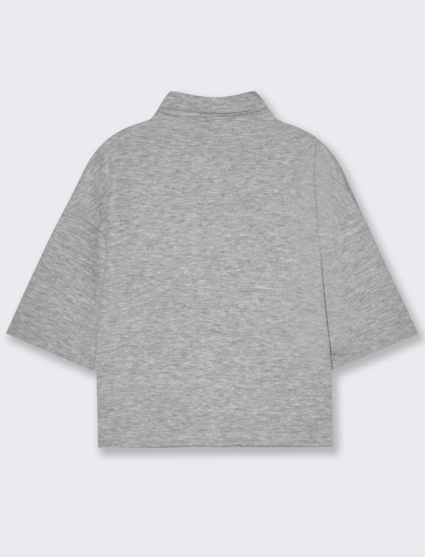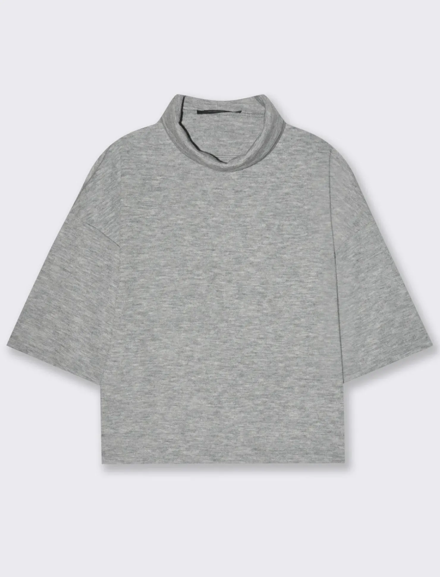 T-shirt in maglia a collo alto, perfetta per aggiungere un tocco di eleganza e calore al tuo guardaroba. Il collo alto offre protezione contro il freddo, mantenendoti comoda durante le giornate più fresche. La maglia è realizzata in un tessuto morbido e avvolgente, che si adatta delicatamente alla tua figura senza stringere. Questo capo è ideale per creare look sia casual che più formali, abbinandolo a pantaloni eleganti o a una gonna per un outfit sofisticato. Il prodotto è di colore Grigio