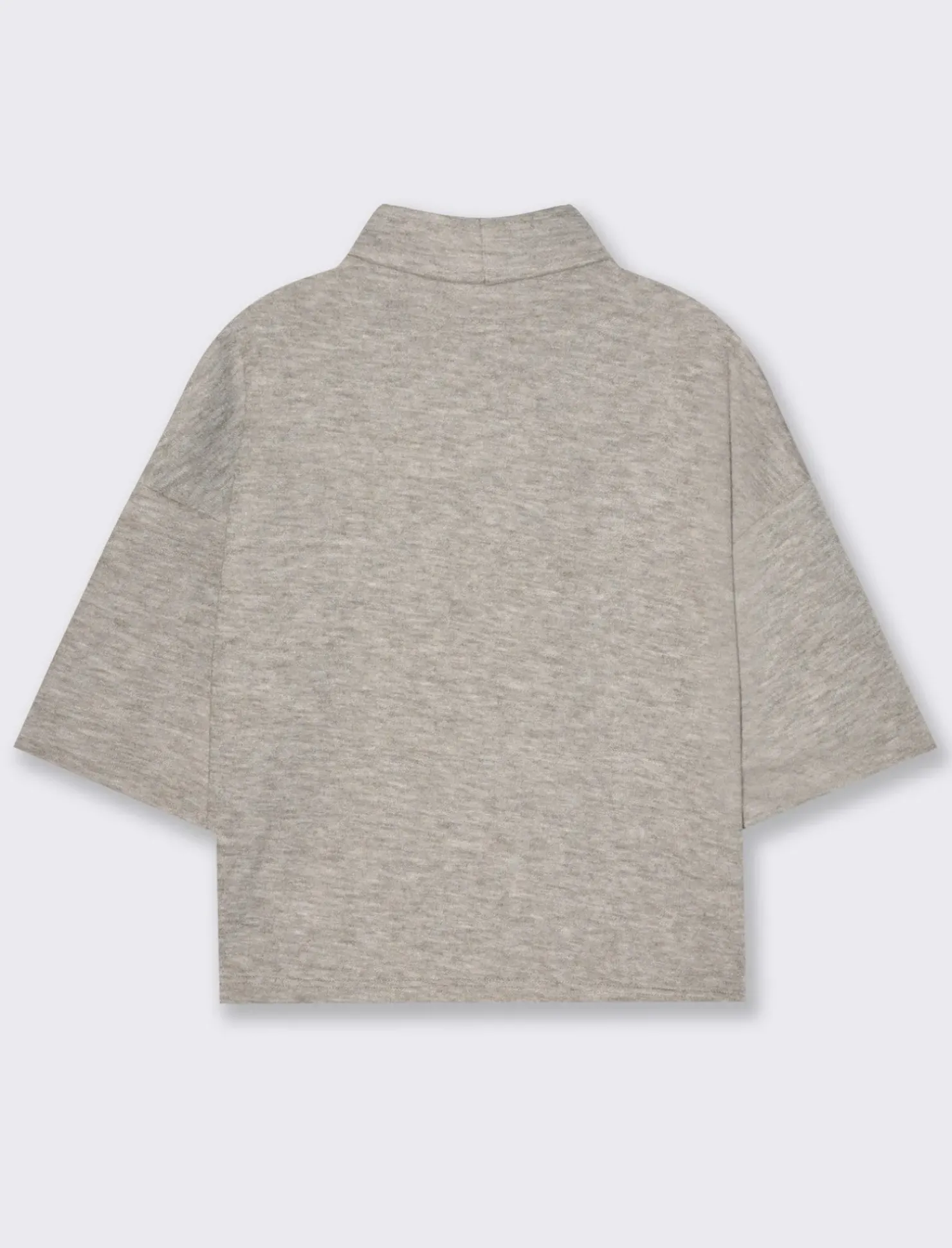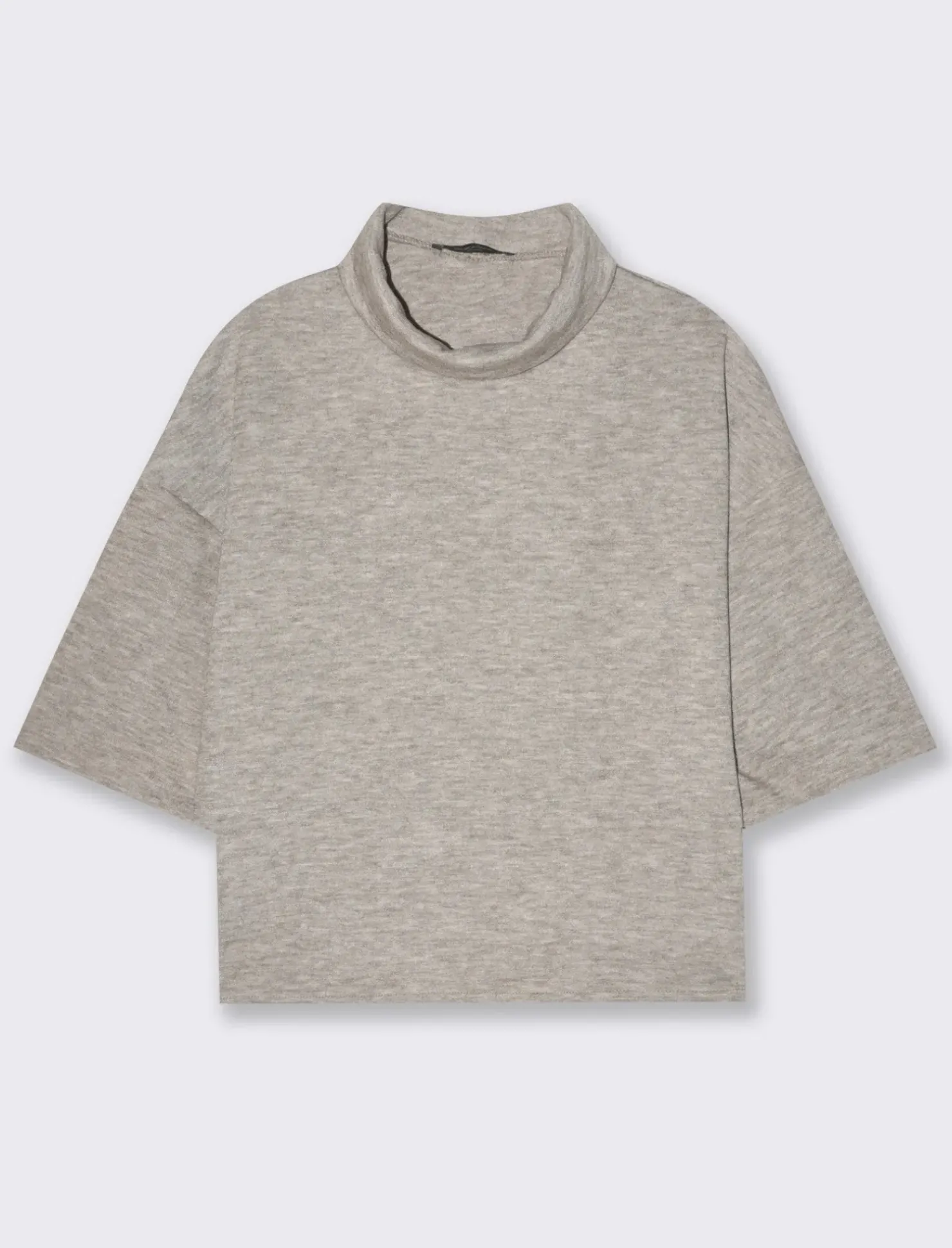 T-shirt in maglia a collo alto, perfetta per aggiungere un tocco di eleganza e calore al tuo guardaroba. Il collo alto offre protezione contro il freddo, mantenendoti comoda durante le giornate più fresche. La maglia è realizzata in un tessuto morbido e avvolgente, che si adatta delicatamente alla tua figura senza stringere. Questo capo è ideale per creare look sia casual che più formali, abbinandolo a pantaloni eleganti o a una gonna per un outfit sofisticato. Il prodotto è di colore Tortora melange
