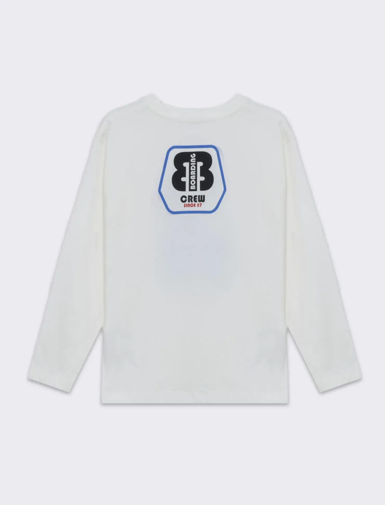T-shirt da bambino in jersey mano pesca, manica lunga. Stampa frontale e posteriore. Modello dinamico ideale per il tempo libero. Il prodotto è di colore Bianco sporco
