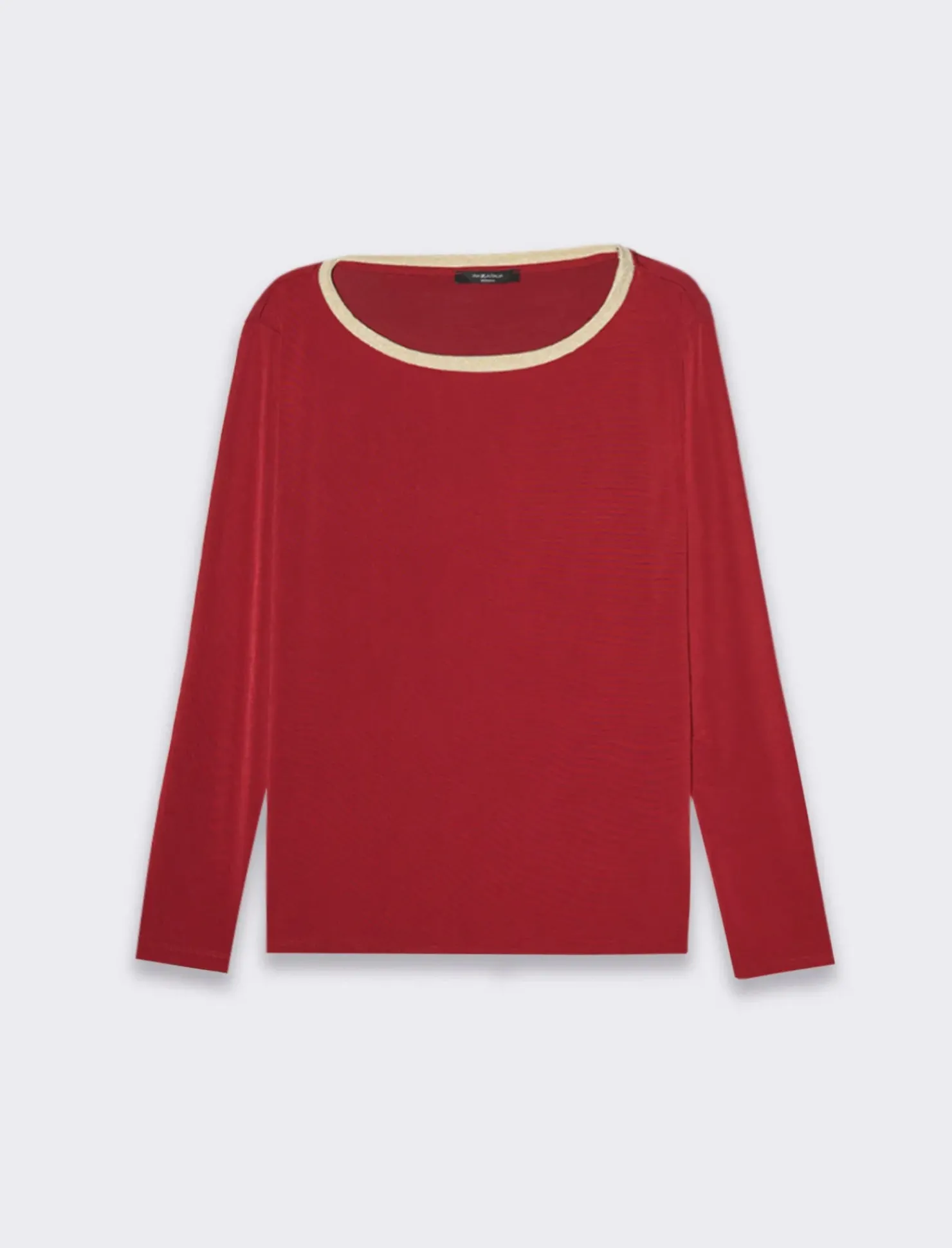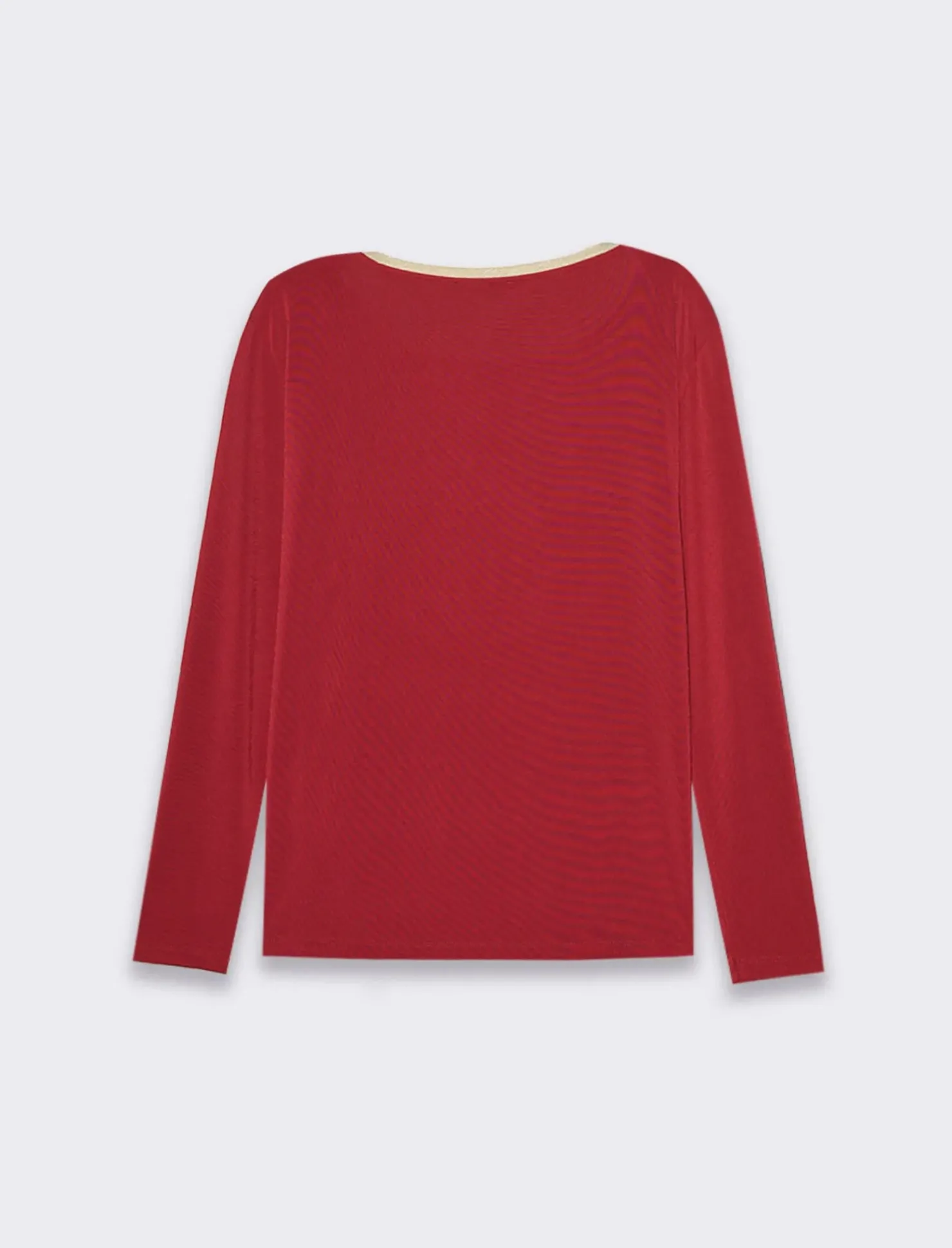Piazza Italia T-shirt manica lunga, girocollo con bordo in filo effetto metallico – Bordeaux Rosso Fashion