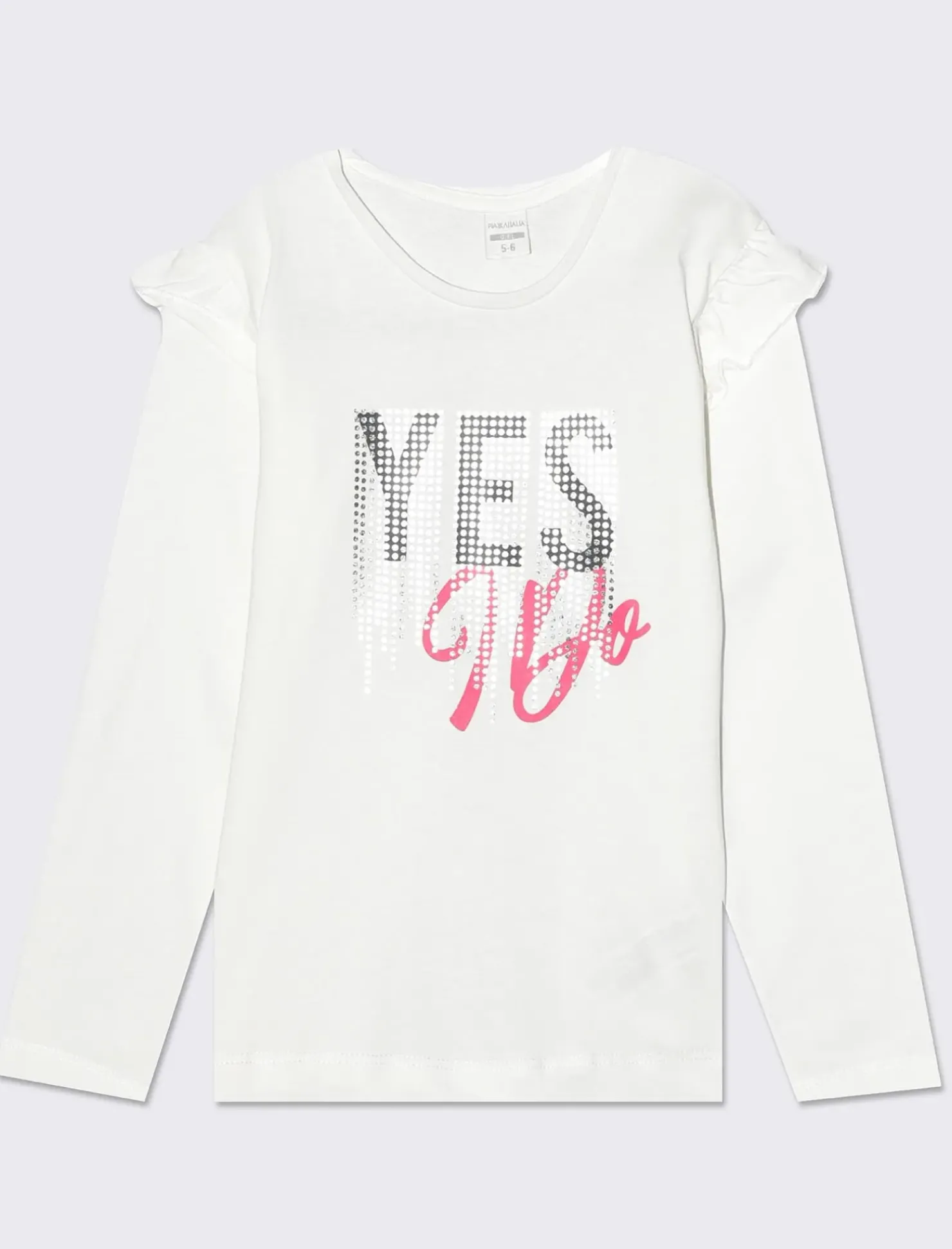 T-shirt manica lunga in cotone caratterizzata da eleganti rouches che donano un tocco di originalità. La stampa con dettagli effetto argento e oro arricchisce il design, creando un look glamour e sofisticato. Perfetta per outfit casual ma ricercati, questa t-shirt si adatta facilmente a diverse occasioni, aggiungendo un elemento di stile e raffinatezza al guardaroba. Un capo versatile che non può mancare nel tuo assortimento di moda. Il prodotto è di colore Bianco sporco