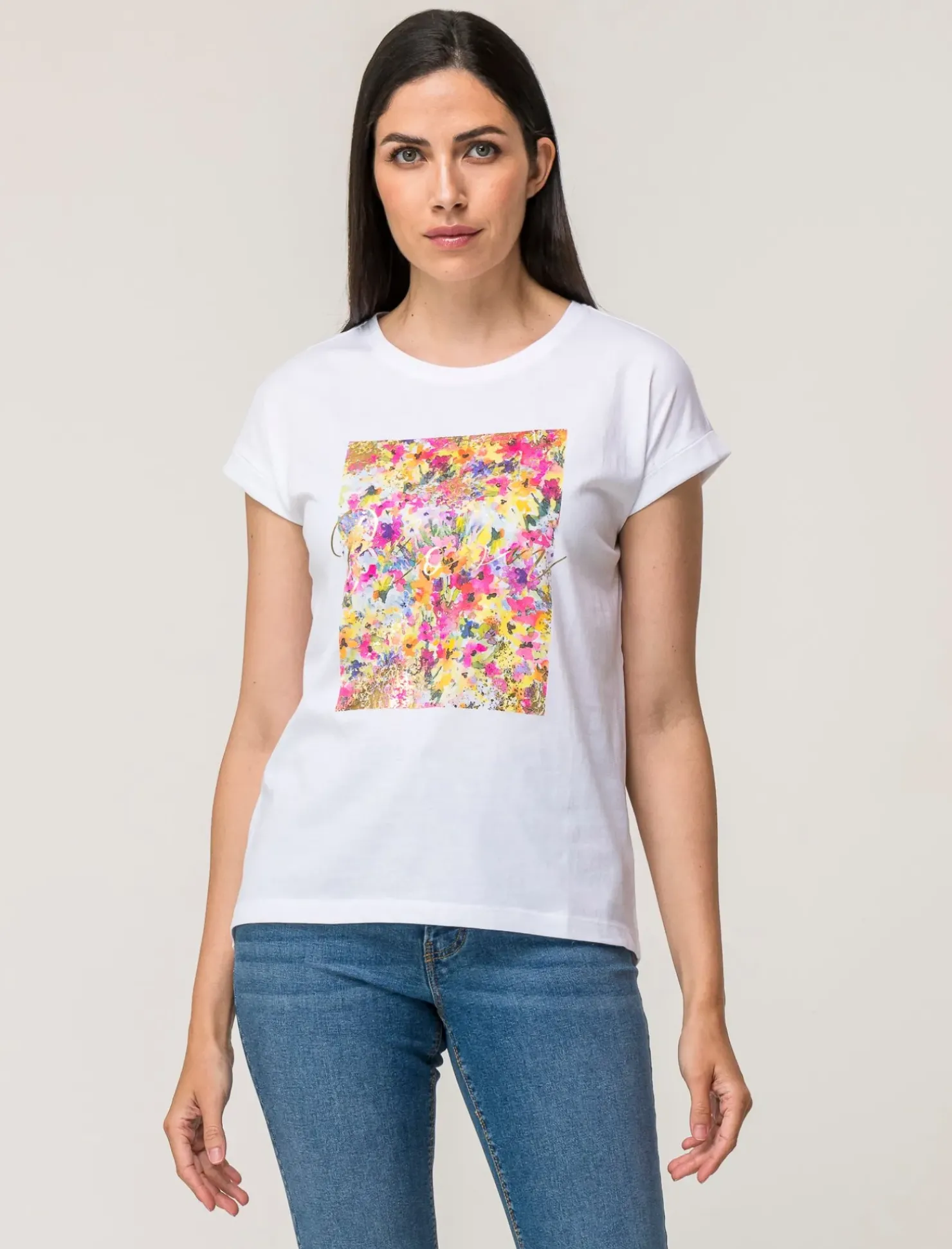 T-shirt mezza manica stampata per donna realizzata in morbido tessuto di cotone, disponibile in vari colori vivaci. Ideale per un look casual e alla moda, perfetta da abbinare a jeans o pantaloni eleganti. Un capo versatile e comodo, adatto a ogni occasione. Il prodotto è di colore var 1