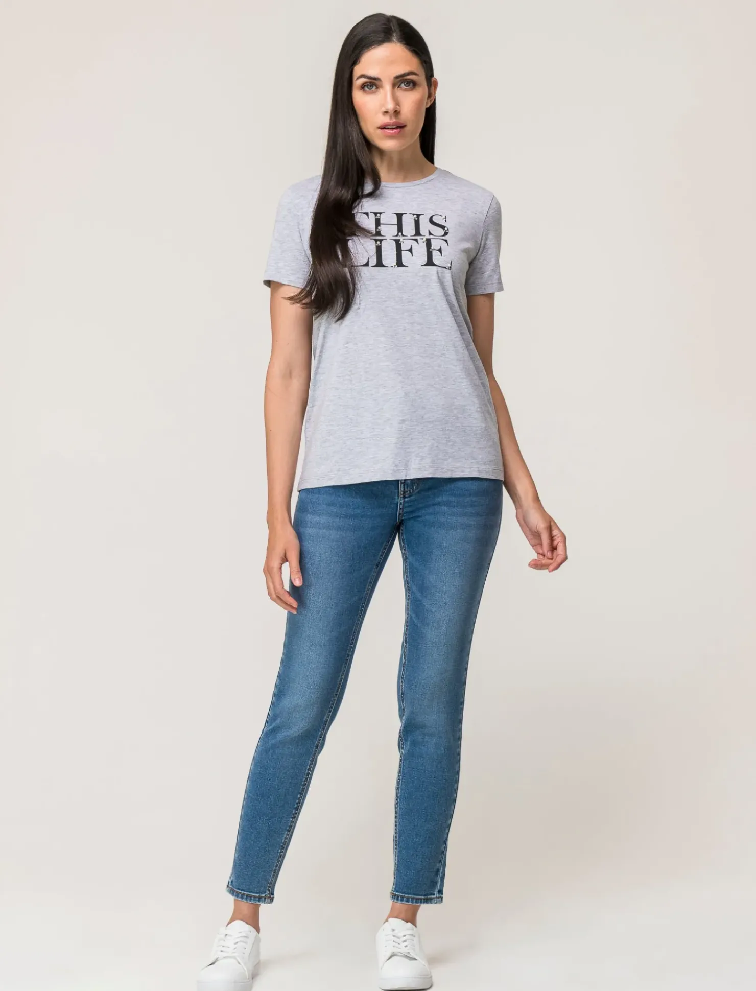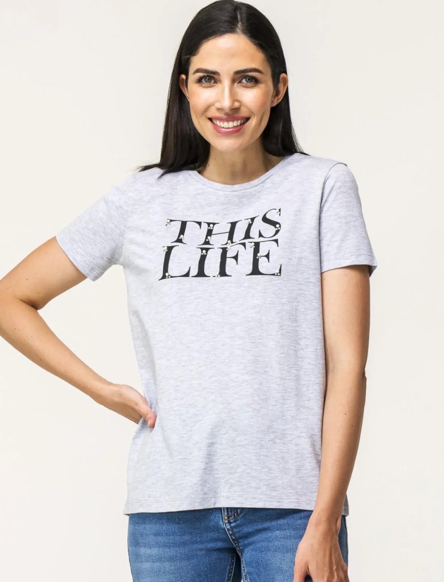 T-shirt mezza manica donna: capo versatile e alla moda per un look casual e chic. Realizzata in tessuto di alta qualità, la vestibilità regular assicura comfort e praticità. La stampa e le applicazioni gioiello conferiscono un tocco di eleganza e originalità. Ideale per un outfit trendy e femminile. Il prodotto è di colore var 3