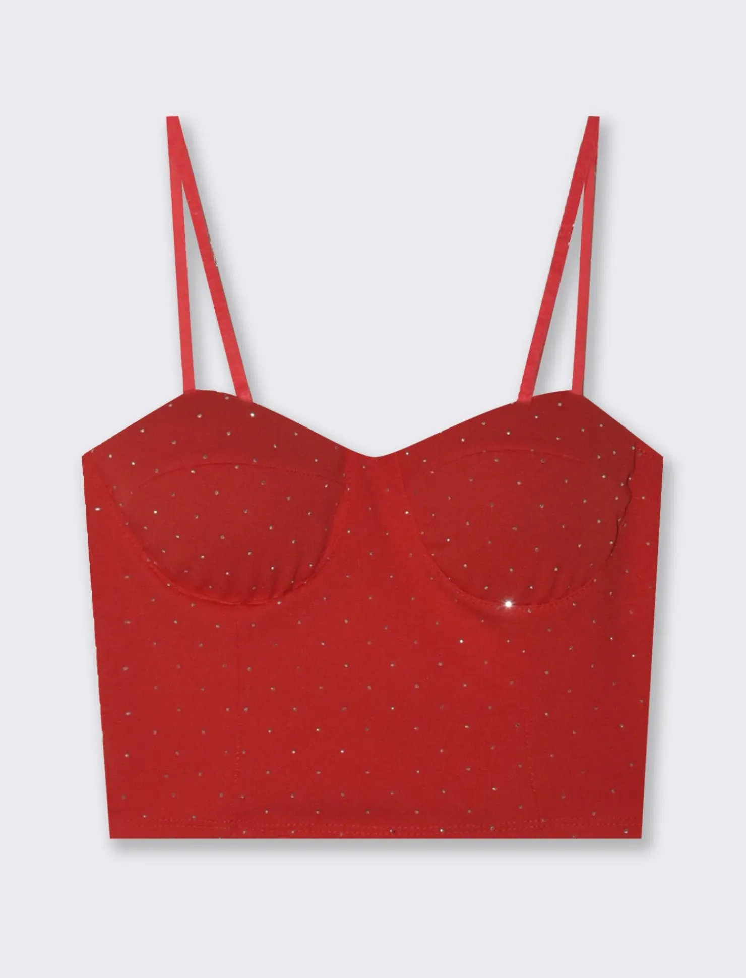 TOP SCOLLO A CUORE CON BRETELLINE E STRASS APPLICATI Il prodotto è di colore Rosso