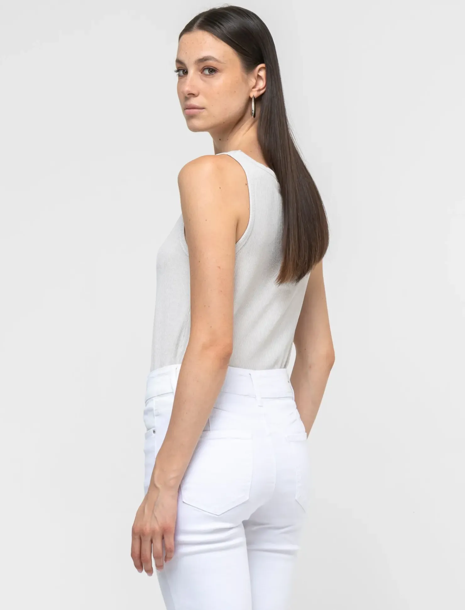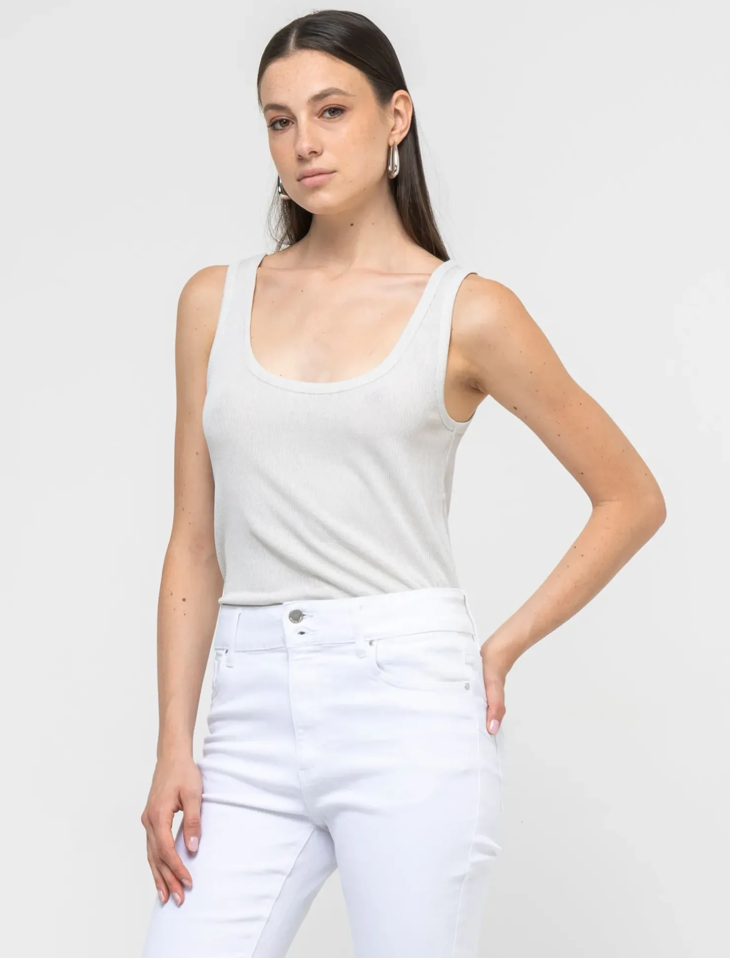 Top elastico aderente per una vestibilità slim e confortevole. Realizzato con una lavorazione a costine e fili effetto metallizzato, questo top è perfetto per un look elegante e alla moda. Ideale per valorizzare la silhouette femminile in ogni occasione. Il prodotto è di colore Avorio