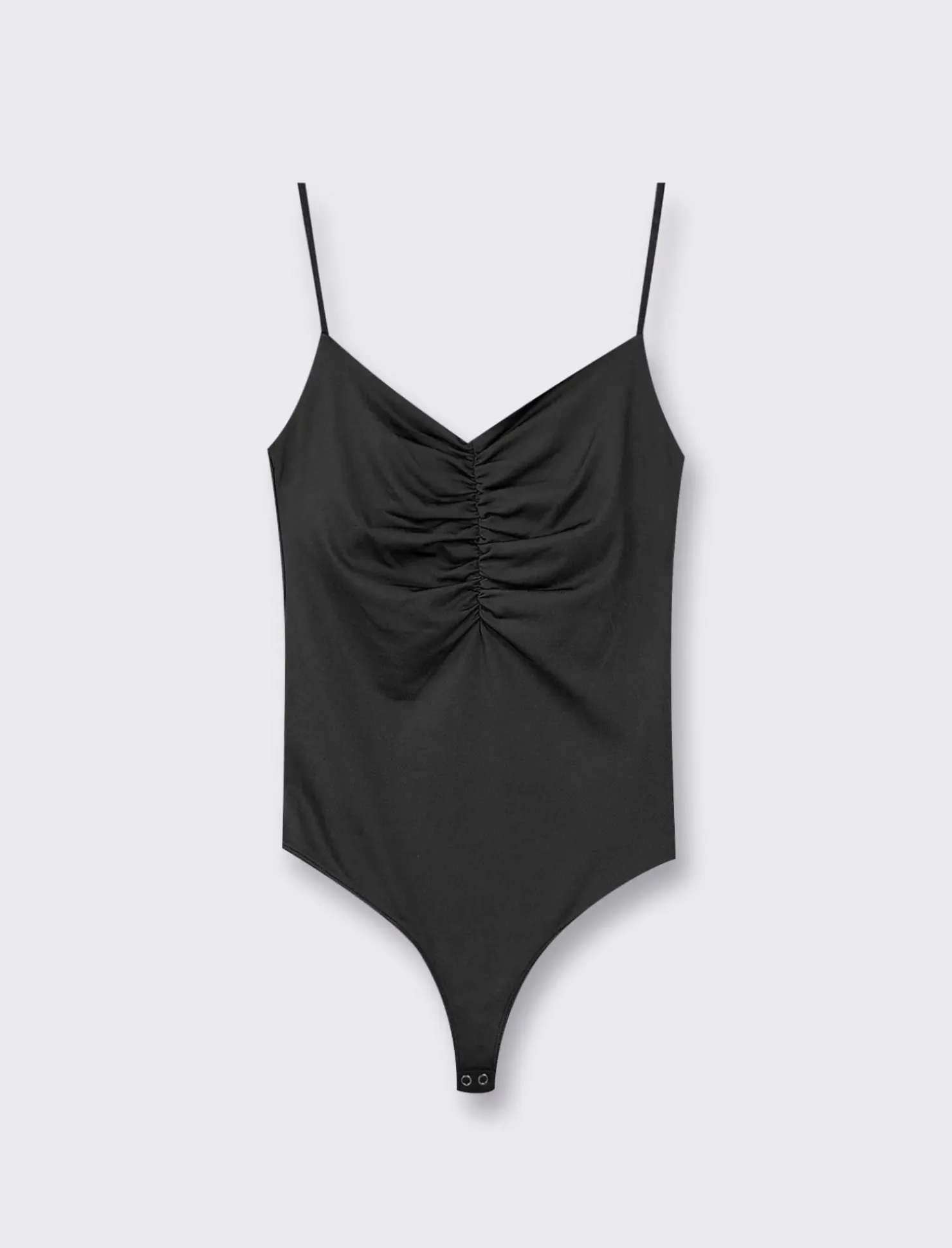 Top modello body con spalline regolabili ed arriccio sul davanti, perfetto per valorizzare la silhouette femminile. La pratica abbottonatura inferiore con snap rende questo capo comodo da indossare e da togliere. Disponibile in una varietà di colori per soddisfare ogni stile e preferenza. Il prodotto è di colore Nero