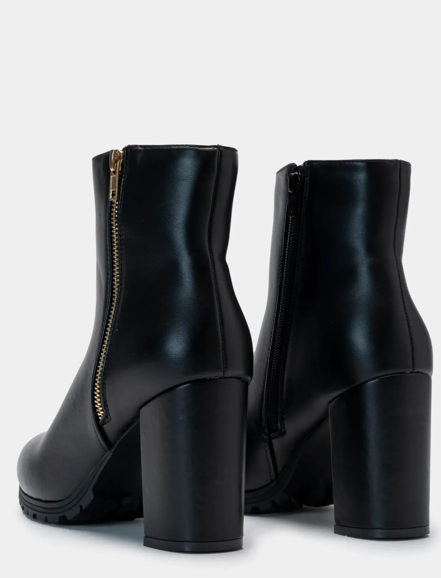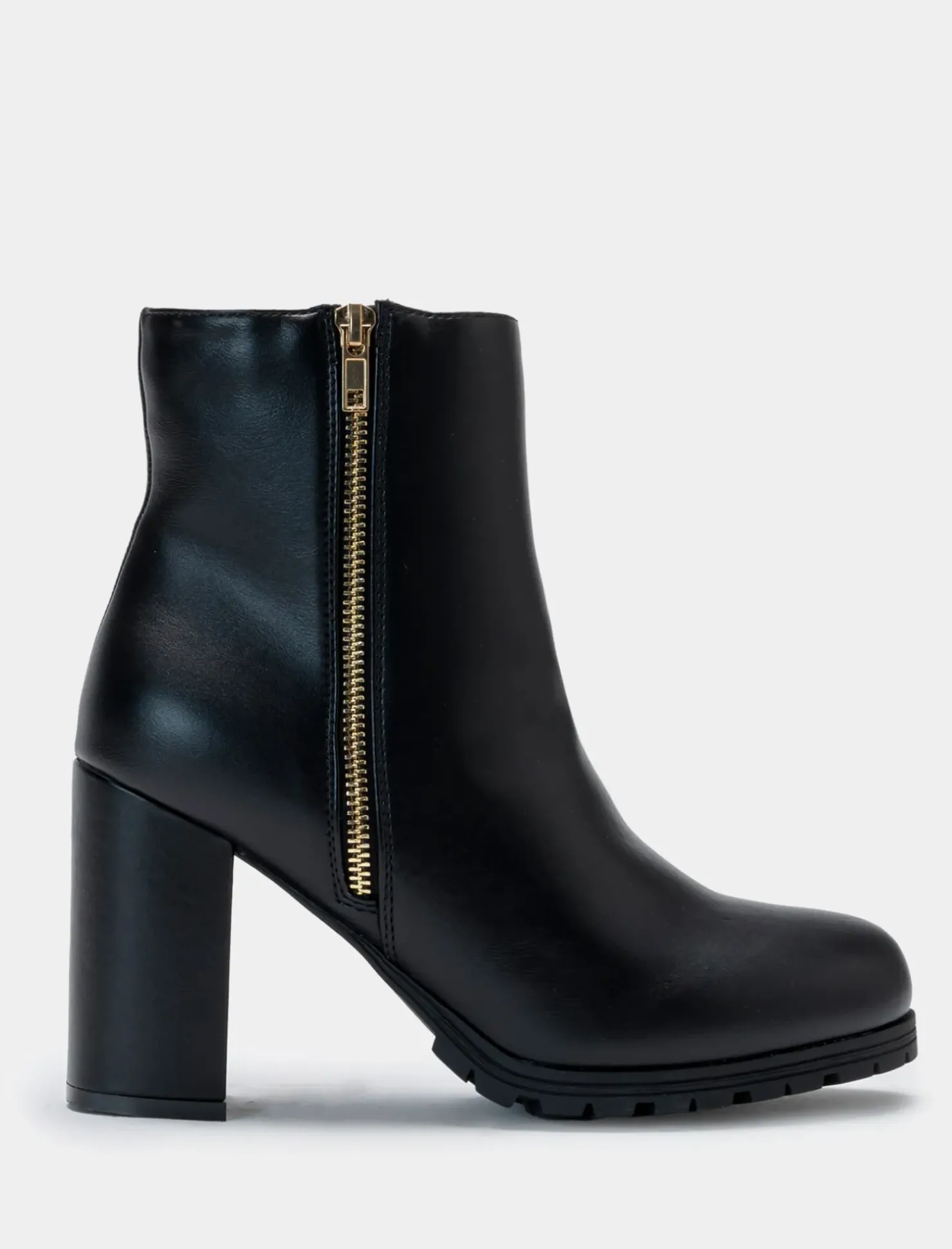 Tronchetto in poliuretano nero con doppia zip laterale per un look moderno e pratico. Il fondo roccia garantisce stabilità e comfort in ogni occasione. Ideale per un outfit casual o elegante, perfetto per completare il tuo stile con un tocco di classe. Il prodotto è di colore Nero