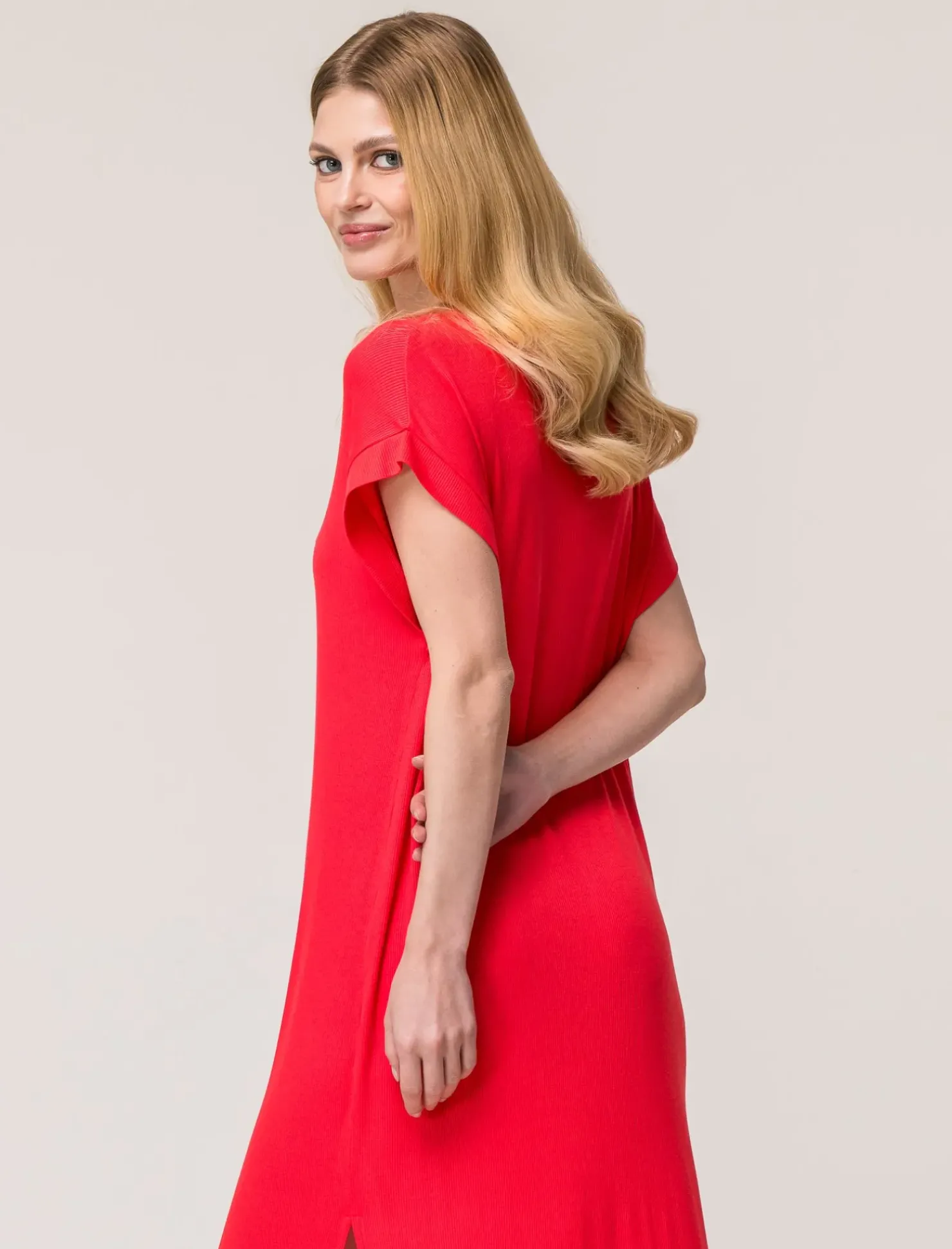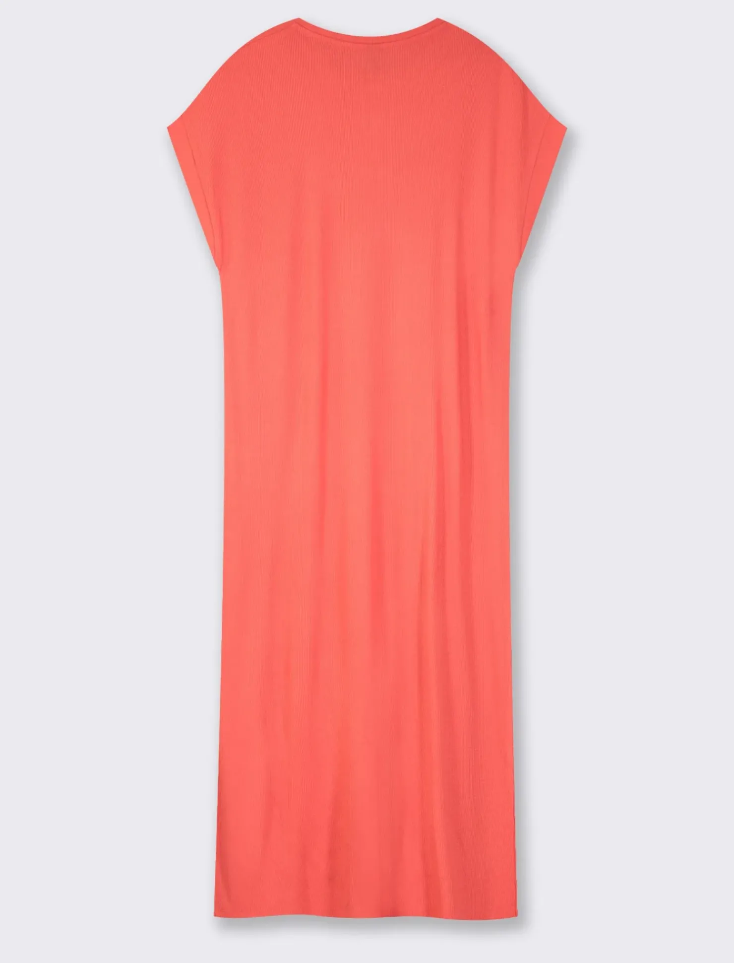 Vestito in viscosa a coste per donna, perfetto per un look casual ma elegante. Il girocollo e le maniche a t conferiscono un tocco di modernità, mentre gli spacchi laterali aggiungono un tocco di originalità. Ideale per un’uscita con le amiche o per una serata speciale. Il prodotto è di colore Corallo